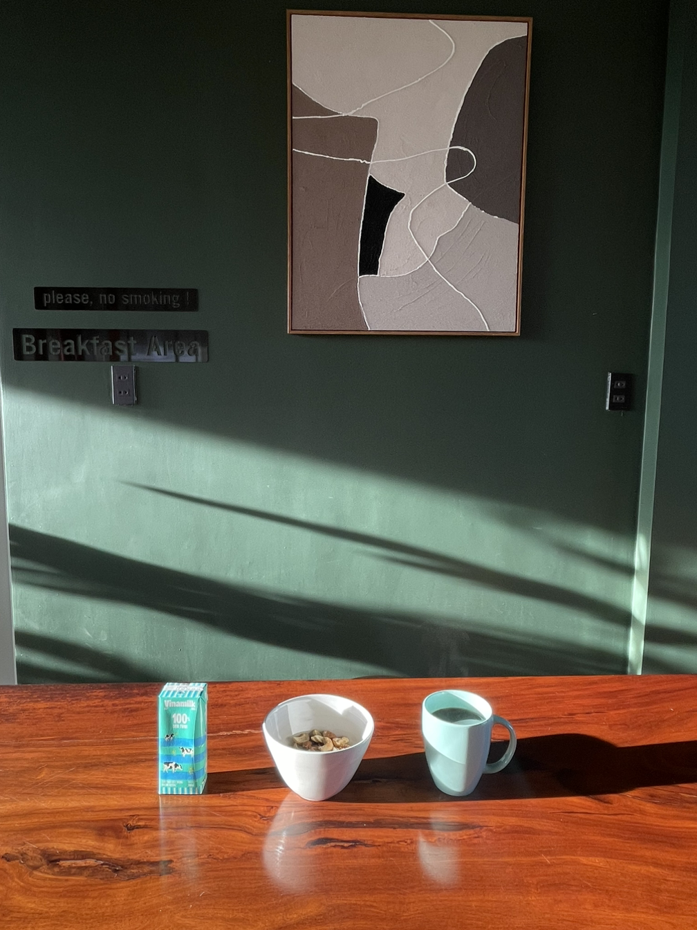 숙소의 조식공간. 엄청나게 다양하지는 않지만, 오트밀 그래놀라 달걀 커피 토스트 크로와상 등등.