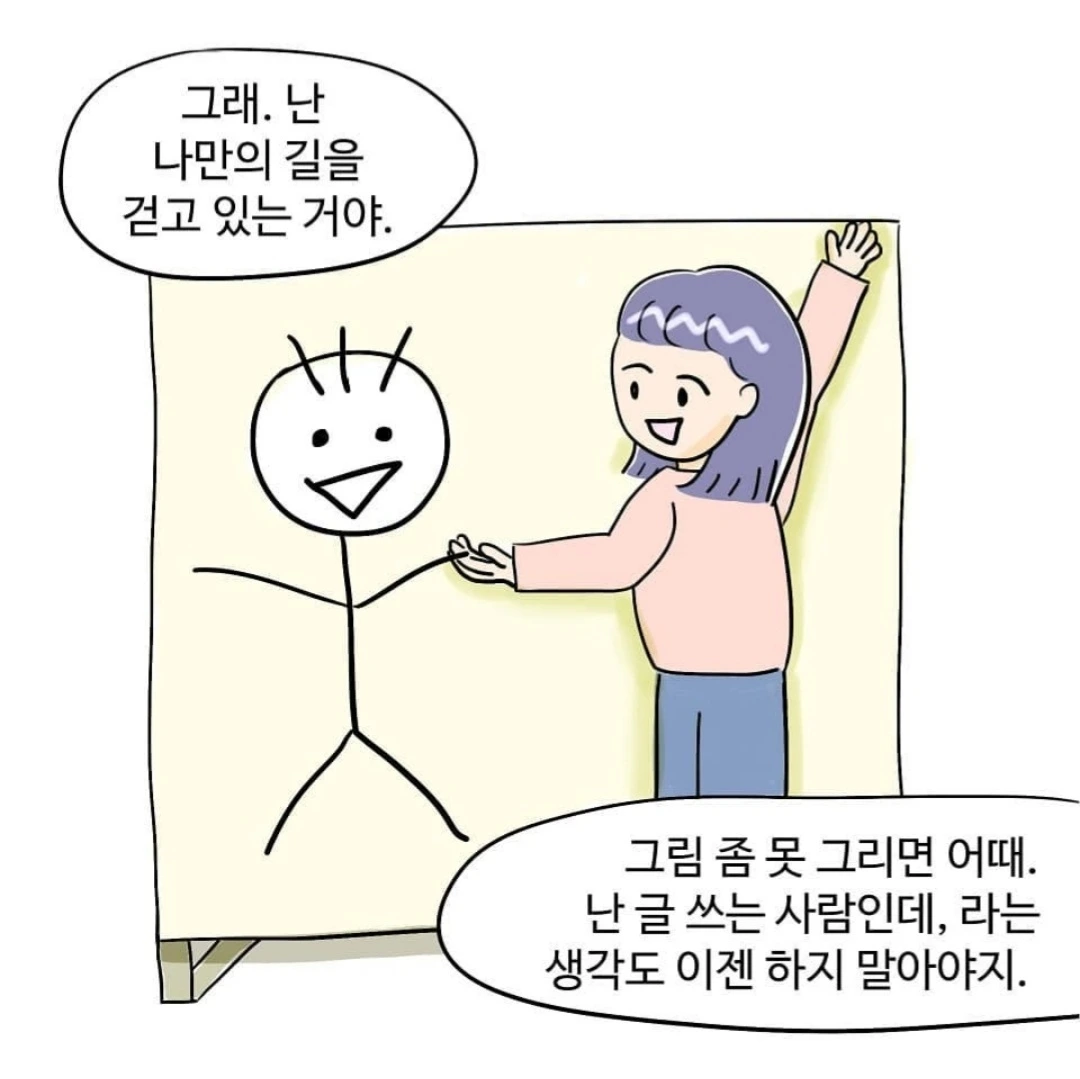 그래. 난 나만의 길을 걷고 있는 거야. 그림 좀 못 그리면 어때 난 글 쓰는 사람인데, 라는 생각도 이젠 하지 말아야지.