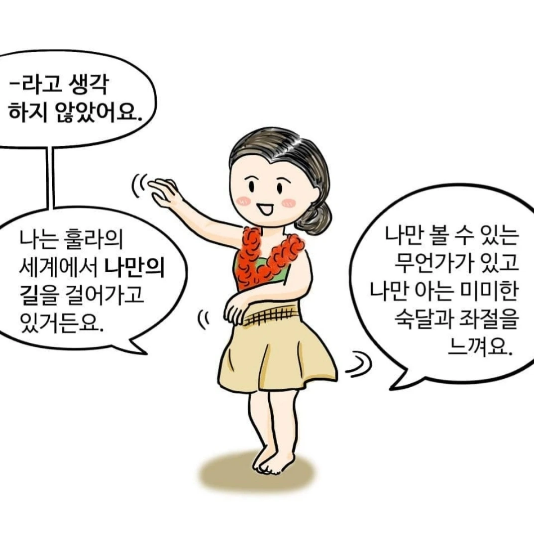 라고 생각하지 않았어요. 나는 훌라의 세계에서 나만의 길을 걸어가고 있거든요. 나만 볼 수 있는 무언가가 있고 나만 아는 미미한 숙달과 좌절을 느껴요.