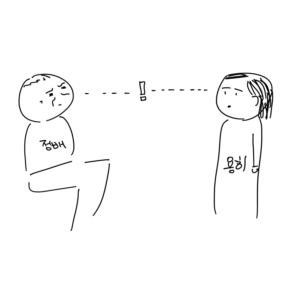 자신을 멀찍이서 빤히 보는 용히와 눈 마주친다