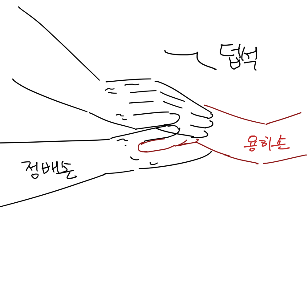 (정배는 두 손으로, 용히의 한 손을)
