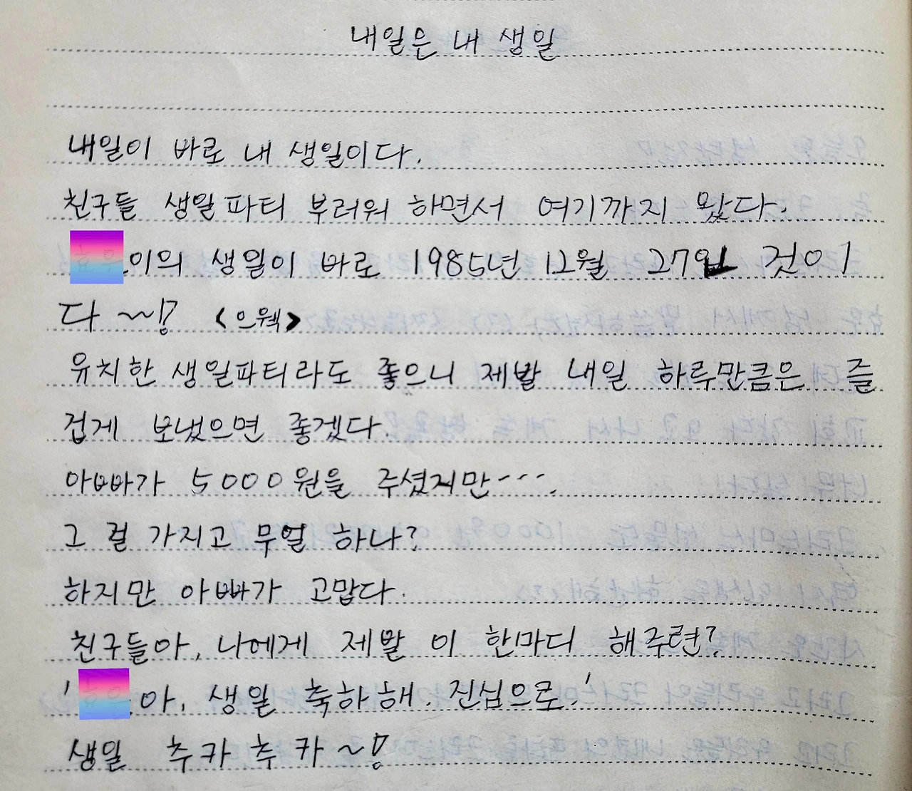 첫줄: 내일이 바로 내 생일이다. 나의 생일이 바로 1985년 12월 27일인 것이다~!!