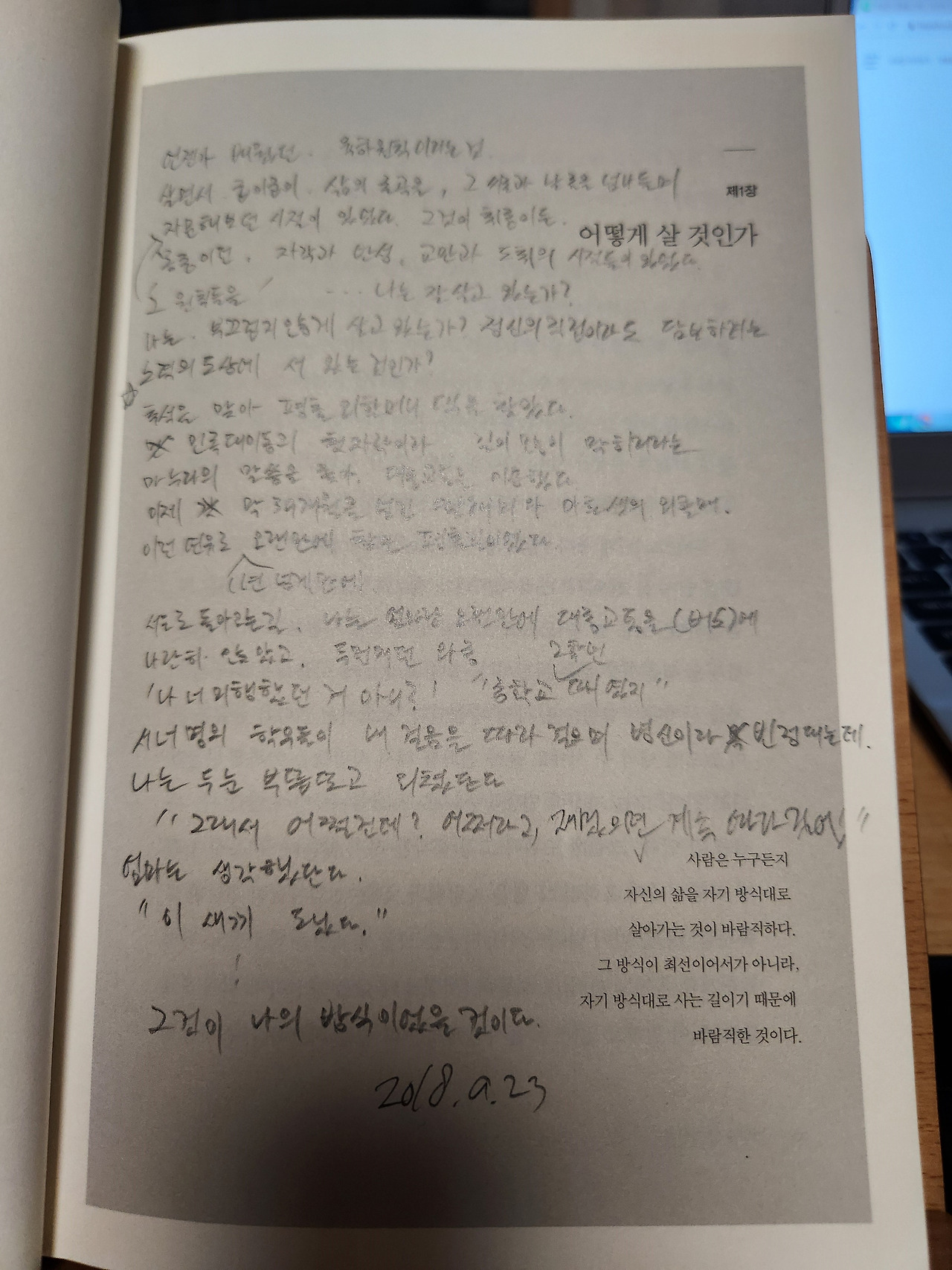 악필임에도 그대로 올려본다. 악필은 온 마음과 몸으로 진심을 다해 쓰는 것이기에 글씨가 저러한 것이라는 나의 오래된 생각을 밝힌다. 또한 이 지경이어서 부끄러워 '필사'를 시도하지 않고 있음도 밝힌다.