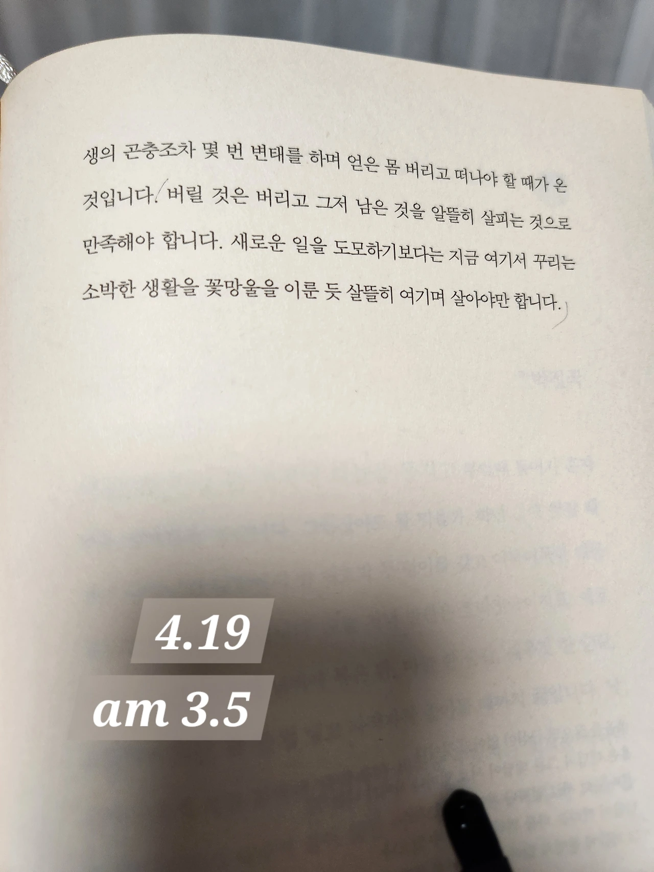 '버릴 것은 버리고 그저 남은 것을 알뜰히 살피는 것으로 만족해야 합니다. 새로운 일을 도모하기보다는 지금 여기서 꾸리는 소박한 생활을 꽃망울을 이룬 듯 살뜰히 여기며 살아야만 합니다.'