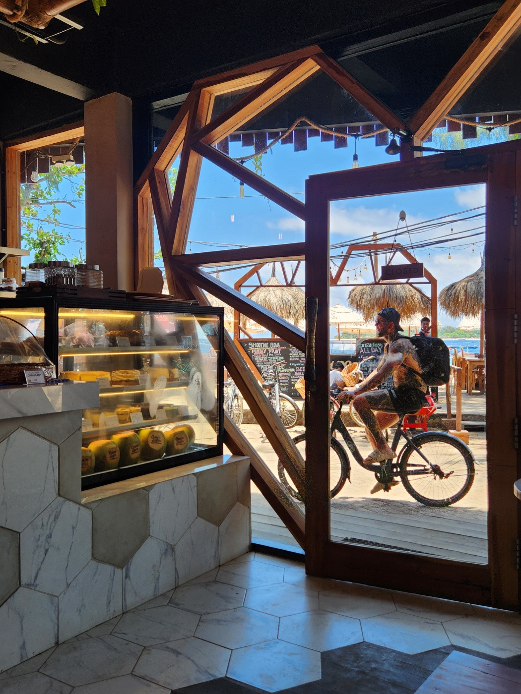 길리 트리왕안에는 에어컨이 있는 카페나 레스토랑이 많지 않다. 대부분 야장을 추구한다. 길리에서 가장 시원한 장소 세 곳만 뽑으라고 하면 숙소 방 안, 편의점, 바닷속을 말하겠다. 특히 항구가 있는 동쪽엔 에어컨 달린 카페가 두 군데뿐이다. 그중 가장 정을 주며 들렀던 카페 <카르페 디엠>은 첫날부터 운 좋게 발견해 들어간 곳이었다. 시원한 바람 아래에서 아이스 아메리카노를 들이켜니 이제야 여유가 생겨 주변을 둘러볼 수 있었다.