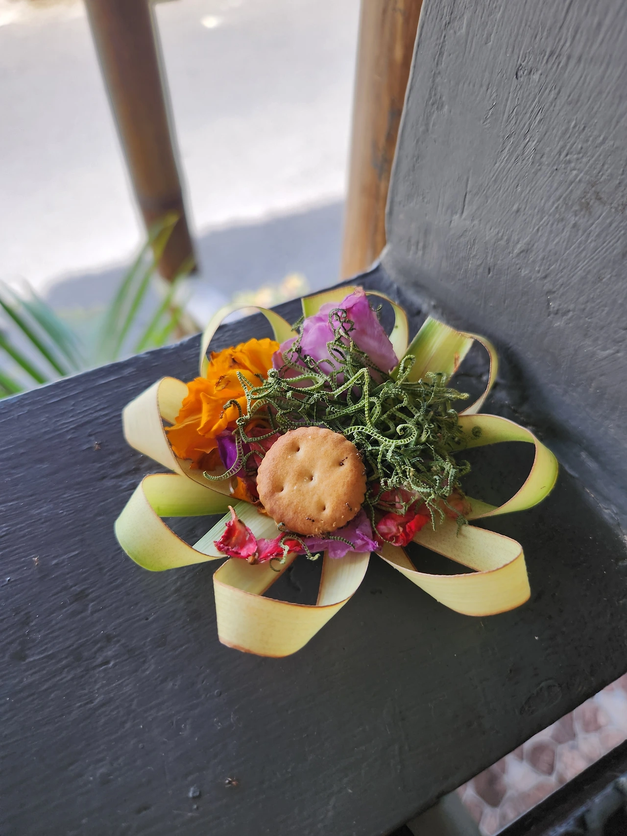 대문 앞마다, 식당의 테라스 자리마다 놓여있는 이 작은 공양물도 인상적이었다. 이름은 '차낭사이'. 힌두교를 믿는 발리인들이 신에게 감사하기 위해 매일 바치는 제물이라고 한다. 거리를 지나다 보면 아침엔 고이 놓여있던 것이 저녁에는 다양한 발걸음에 치여 흩트려져 있는 것을 발견할 수 있는데, 그다음 날 아침이면 또다시 새로 장만한 치낭사이가 나와 있다.