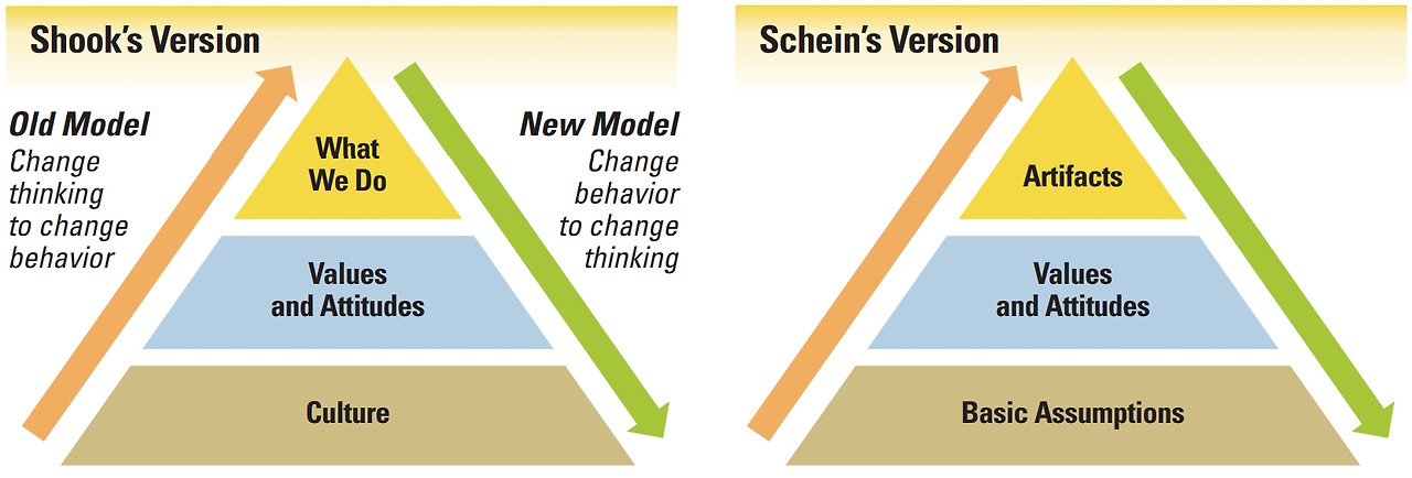 조직 변화(organizational change)에 대한 전형적 서구의 사고방식은, 모든 사람이 올바른 방식으로 생각하도록 노력하는 것부터 시작하는 것이다. 이것은 그들의 가치(values)와 태도(attitudes)를 변화시키고, 자연스럽게 올바른 일을 시작하게 한다.