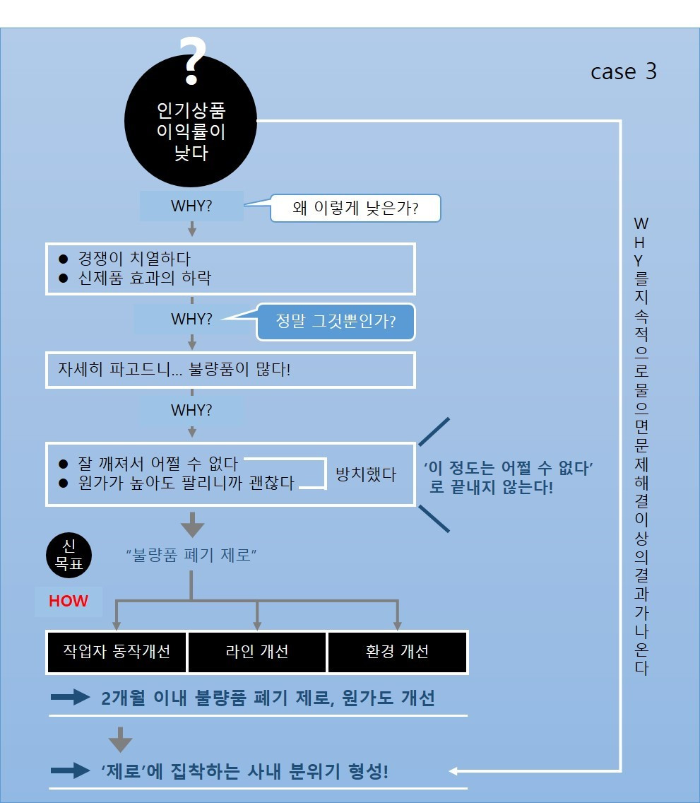 그 후 A사에서는 ‘제로에 집착한다’가 표어가 되었습니다. 주제는 낙하 제로, 실수 제로 등 무엇이든 될 수 있습니다. 어떤 작은 문제에 대해 ‘이 정도는 어쩔 수 없다’, ‘내버려둬’가 아니라, ‘제로로 만들어 보이겠다’는 목표를 세워 ‘왜’를 반복해 진짜 원인에 접근, 개선을 실행한다는 의식이 확산되었습니다.