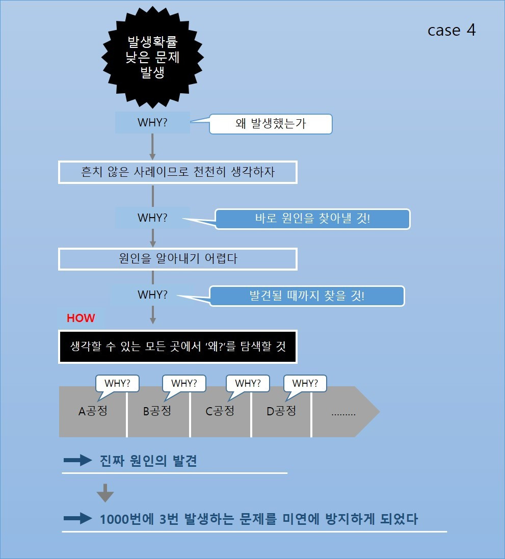 오노 다이이치가 A씨에게 요구한 것은 확률에 상관없이, 불량이 발생한 이상 그 진짜 원인을 며칠이 걸리더라도 찾아내는 자세였습니다. ‘왜’를 깊이 파는 것도 중요하지만, ‘왜’라는 질문을 생각할 수 있는 모든 공정에 던져 보는 것입니다.