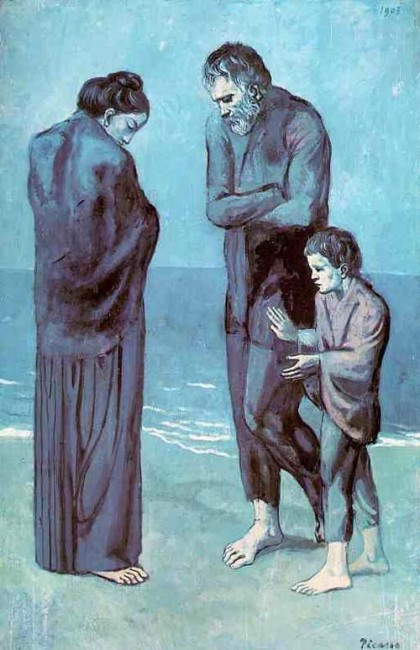대표작 <Old Beggar with a Boy> (1903)와 <Poor People on the Seashore>(1903)는 그의 청색 시대를 대표하는 작품입니다. 작품 속 등장인물들은 무표정한 얼굴로 허공을 응시하거나 절망적인 자세를 취하고 있으며, 웅크린 자세와 함께 색채 또한 차갑고 어두운 푸른빛으로 가득 차 있습니다. 애써 외면하고 싶었을 장면을 피카소는 두 눈을 똑바로 뜨고 응시한 채 그들의 삶을 캔버스 안에 또박또박 그려 넣었습니다.