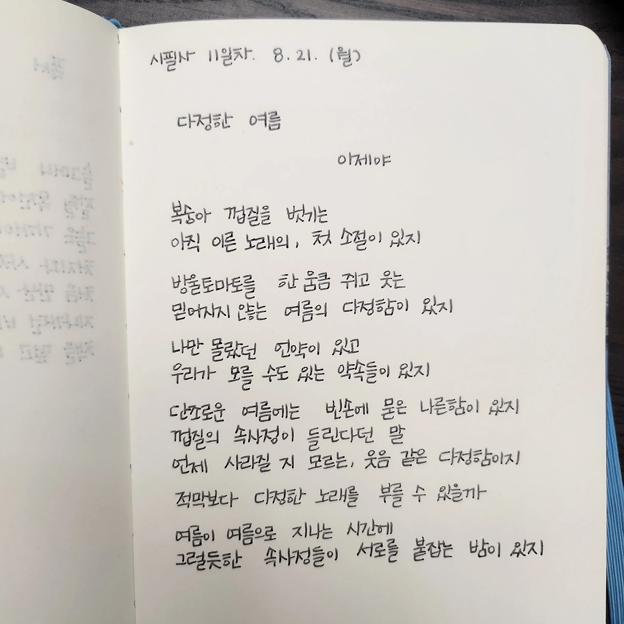 시필사 11일 차. 8. 21. (월) 이제야, ‘다정한 여름'