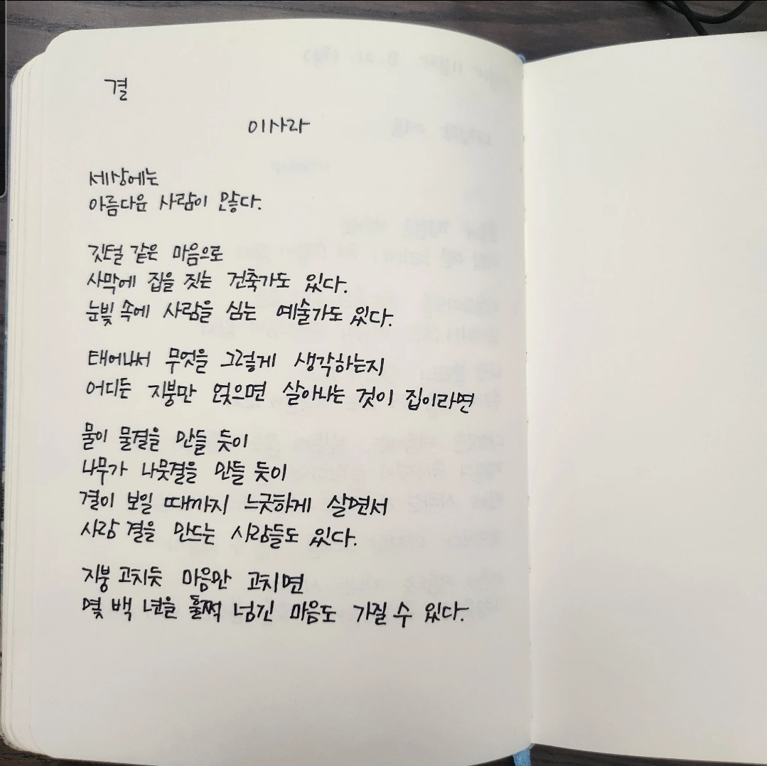 시 필사 모임에서 열두 번째로 배달된 시는 이사라 시인의 '결'이었습니다. 나의 '결'은 무엇일까, 나는 어떤 결을 만들고 있을까 하고 생각하게 만드는 시였어요.