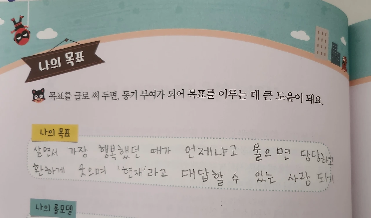 그런데 어제 큰애가 그런 저를 부끄럽게 만들었어요. 7학년이 된 큰애랑 새롭게 '사자소학'을 공부하기 시작했는데요(폴란드에서 소학을 가르치는 조선시대 훈장스타일 엄마... 그게 접니다.) 학습서 맨 앞장에 '목표'를 적는 칸이 있었어요. 마음 끌리는 대로 한번 적어봐, 하고 학습서를 방에 두고 나왔는데, 등교한 후에 아이방에 가보니 이렇게 적혀있네요.