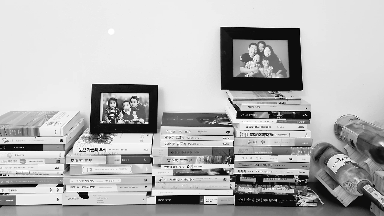 이런 과정을 거쳐 색깔과 폰트와 제목에 공을 들인 책탑이 완성되었다. 마지막으로 책만 올려두면 왠지 허전한 듯하여 분위기 좋아 보이게 가족사진도 위에 올려두었다. 그런데 사진을 올려두며 '이렇게 책 위에 액자를 두면 나중에 책을 꺼낼 땐 너무 불편하겠는데' 하는 생각이 마음을 스쳤다.
