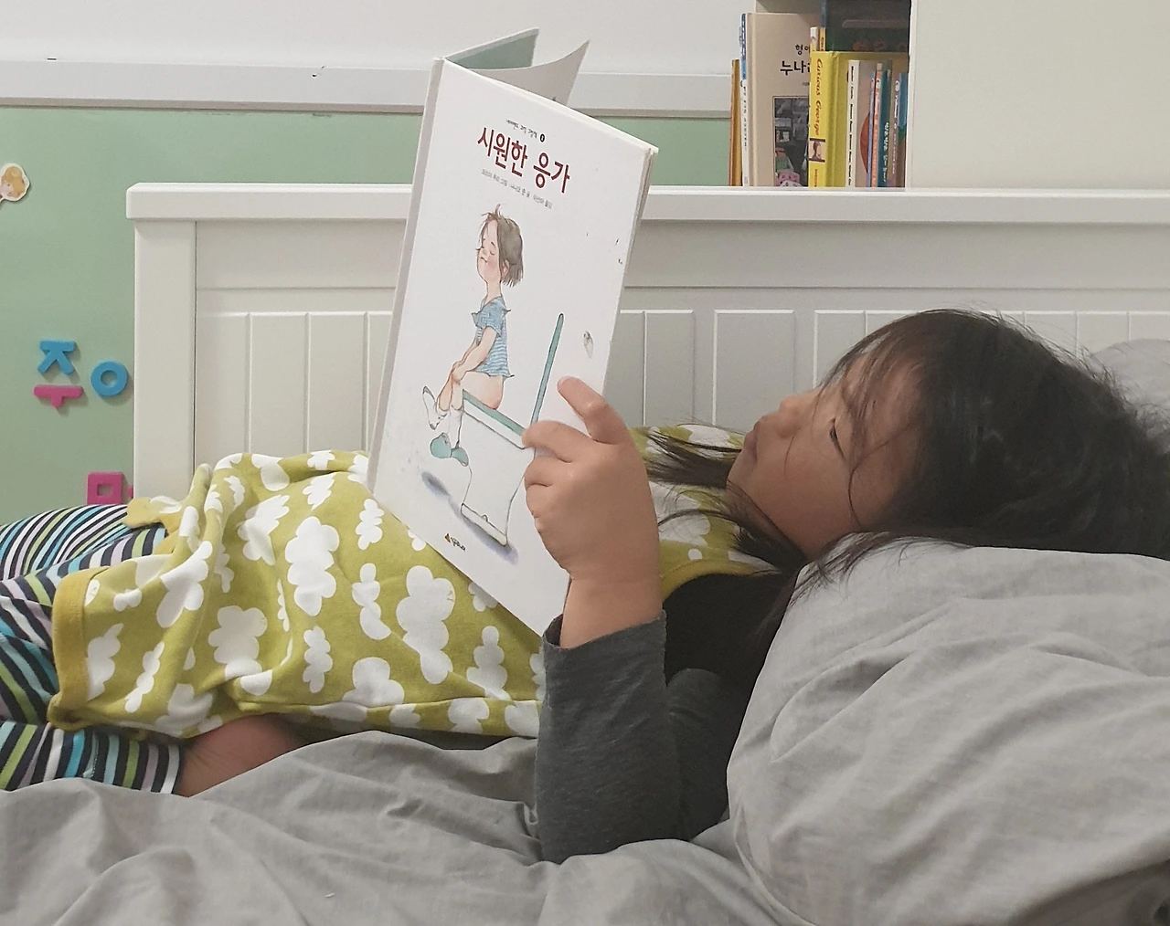 아이의 책벌레 기질을 발견했던 건 생후 2개월 무렵이었다. 산모교실에서 사은품으로 받은 회음부 보호용 엉덩이 쿠션이 있었는데 산후조리 시기가 끝나고 필요가 없어져서 동네 맘 카페에 무료드림 글을 올려 누군가에게 쿠션을 양도했다. 물건을 받으신 분이 고맙다며 그림책 몇 권을 가져다주셨는데 안도현 시인의 동시를 예쁜 삽화와 함께 한 페이지에 한 행씩 옮겨 적은 동시 그림책이었다. 그 책이 우리 아이가 최초로 읽은 그림책이다. 이제 겨우 흑백모빌에서 컬러 모빌로 넘어갈 정도로만 시력이 발달했을 그 작은 아기가, 넘어가는 책장과 그림에 동그랗게 눈을 모으며 집중하는 게 보였다. 그 모습이 신기하고 귀여워서 그 뒤로 알음알음 아기가 읽을만한 그림책을 사 모으기 시작했다. 아무래도 책을 읽기보다는 물거나 빨거나 찢기 쉬운 나이라서 종이책보다는 보드북이나 헝겊책을 샀었는데, 나중에 알고 보니 얘는 책을 찢지도 먹지도 물지도 않고 책이라는 물성을 소중히 여길 줄 아는 아기였다. (물론 그 책들은 나중에 둘째와 셋째가 열심히 찢어 먹었다.) 그때부터 하루에 한 권씩은 꼭 그림책을 읽어줬으니 그래도 꽤 이른 시기부터 책을 읽어준 셈이다.