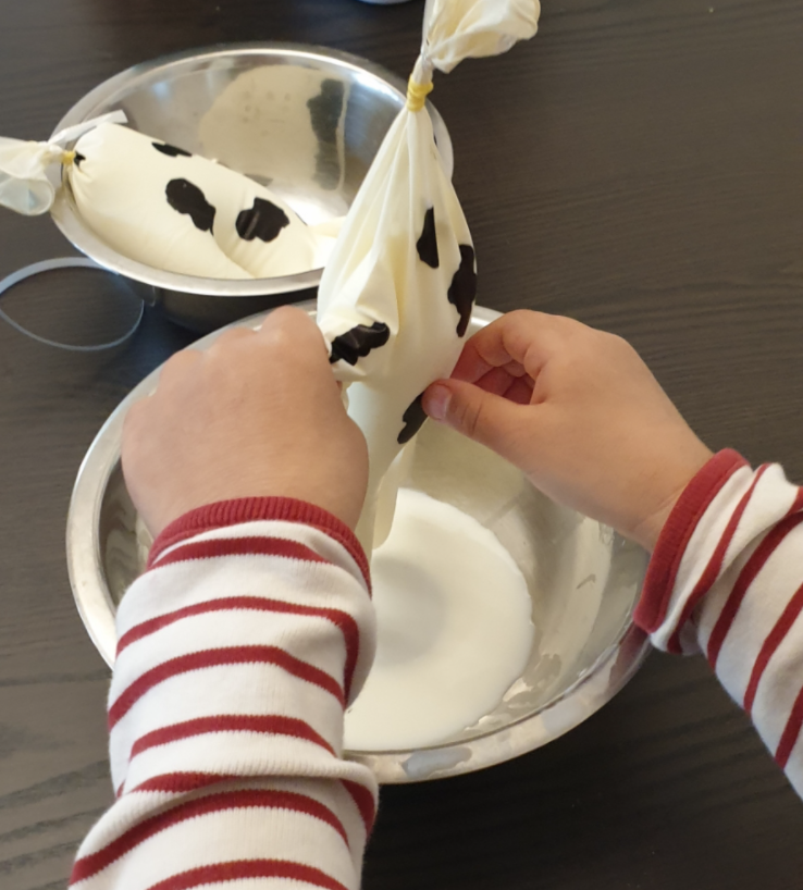 그냥 먹기만 해서는 심심하니까 온갖 창의적인 내용을 생각해서 함께 활동해보기도 했다. <꿀꺽꿀꺽 우유 이야기>라는 그림책을 읽고는 그냥 우유만 마시기에는 아쉬워서, 그렇다고 우유를 직접 만들어 먹을 수는 없어서(우리는 젖소가 아니니까), 하얀색 라텍스 장갑에 젖소 무늬 그림을 그려 젖 짜기 체험을 하기도 했다. 홈스쿨링 사전에 불가능이란 없다.