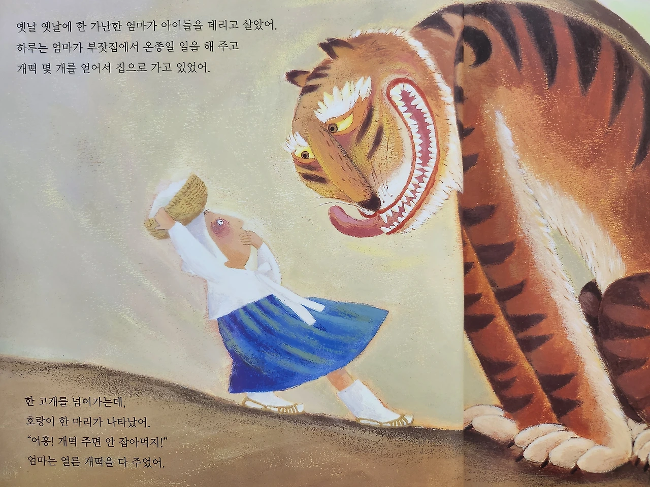 원래 원작대로라면(전래동화에 과연 원작이라는 개념이 있을까 의심스럽지만은) 이야기 속의 엄마는 '떡 하나 주면 안 잡아먹지'하고 말하는 호랑이에게 한 고개에 떡 하나씩 던져주며 총총 집으로 발길을 향해야 한다. 그런데 이 그림책에 등장하는 겁먹은 엄마는 첫판에 가지고 있는 개떡을 몽땅 다 줘버리고 만다. 아이코, 하는 안타까움을 뒤로한 채 다음 고개에서 호랑이는 "어흥! 저고리 주면 안 잡아먹지!"하고, 그다음 고개에서는 "어흥! 치마 주면 안 잡아먹지!" 하며 예상치 못한 전개로 엄마를 야금야금 벗겨 버린다. 마지막 고개에 이르러 호랑이는 엄마처럼 저고리와 치마를 입은 고운(?) 자태로 한입에 꿀꺽 엄마를 삼켜버린다. 아, 호랑이는 도망칠 틈도 주지 않고 엄마를 꿀꺽 삼켜버려야 했고, 이후에 엄마로 분장해서 오누이네 집으로 가려면 그녀의 옷이 필요했으니... 어쩌면 먼저 옷을 얻은 후에 잡아먹는 이 새로운 해석이 논리적으로 더 들어맞을지도 모르겠다. 이후의 이야기는 우리가 아는 바와 크게 다르지 않다.