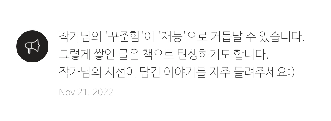 이런 내 이야기가 왜 글이 되어야 하는 걸까. 이렇게 평범할 수 없는 하루라도 매일 꾸준히 글로 옮긴다면, 그럴듯한 무언가가 되어있을까. 작가님의 시선이 담긴 이야기를 자주 들려달라는데, 내 '시선'을 '자주' 내보이면 그 끝에는 무엇이 남아있는 걸까. 작가님의 시선이 담긴 이야기를 자주 들려주세요.