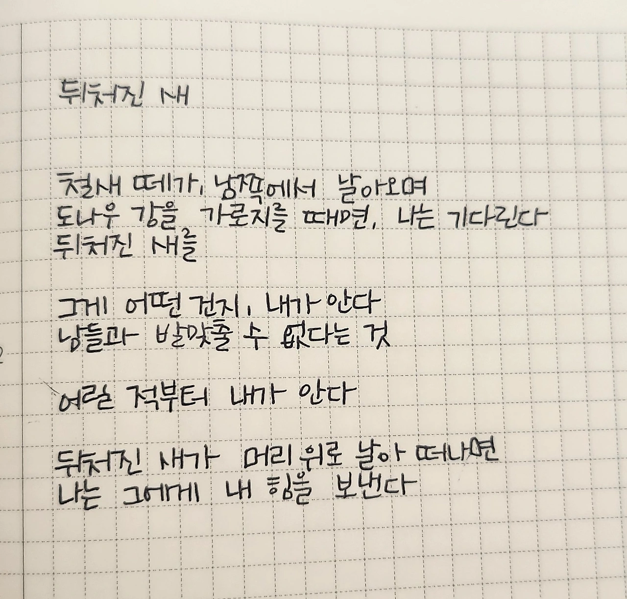 고속도로를 달리는 차 안에서 시를 필사했습니다. 덕분에 글씨가 '괴발개발(저 이 단어 참 좋아합니다. 어린 시절부터 개발새발이 맞는 표현인 줄 알고 살아왔다가 중학생이 되어 괴발개발이라는 듣도 보도 못한 표준어(!)를 처음 접했을 때의 충격을 아직도 잊지 못해요.)'하다고 양해를 구했는데, 대체 어디가 괴발개발한 거냐는 필사모임 멤버들의 항의를 들었네요. 평소의 제 글씨도 이 상태에서 크게 다르지는 않았던 모양입니다.