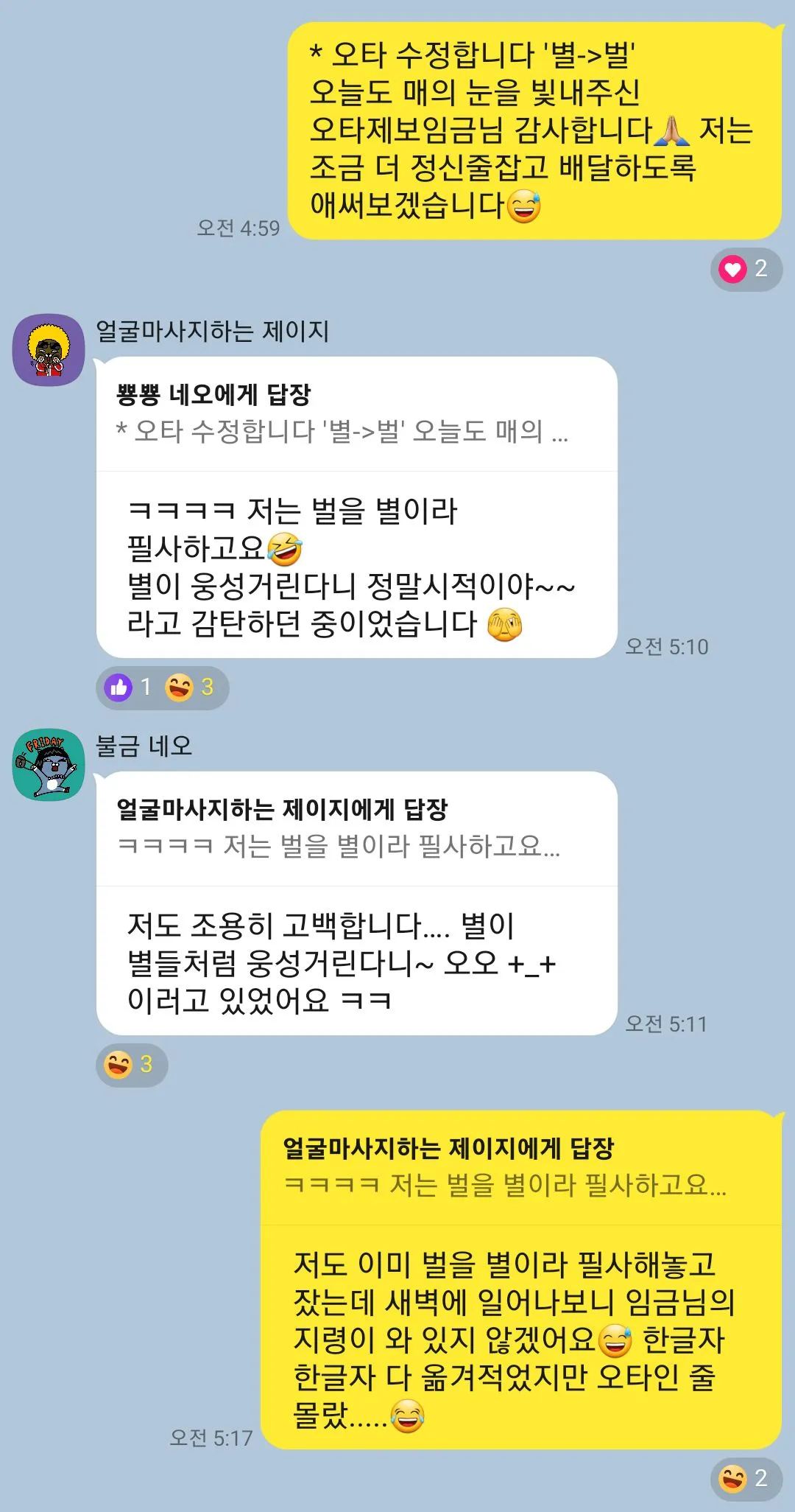 그렇게 마음도, 마을도 돌아다니며 오타를 낸 바로 다음 날, 두 번째 오타가 도착하고 말았습니다. 별들은 귓속의 벌들처럼 웅성거려야 하는데, 별들은 별들처럼 웅성거린다고 배달해 버렸지 뭐예요. 그런데 이번에는 오타를 꽤 늦게 발견해 버린 덕분에 저도, 멤버들 몇 분들도 벌을 별이라고 이미 필사해 버린 후였습니다. 저의 필사 노트는 오늘의 증거자료로 제출하기 위해 따로 수정하지 않았지만, 다른 분들의 필사 노트에선 '별'을 '벌'로 수정하기 위해 'ㅓ'모음이 유난히 두꺼워진 장면들을 포착할 수 있었어요. 그러나 이런 해프닝에도 유쾌하게 이해해 주고 넘어가주는 멤버들. 미안하고 사랑합니다.