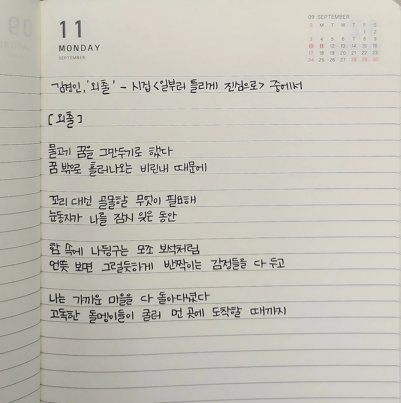 시필사 26일 차. 9. 11. (월) 김경인, '외출' - 시집 <일부러 틀리게 진심으로> 중에서