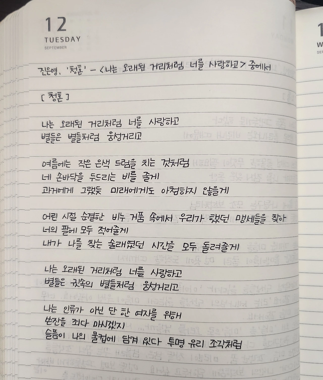 시필사 27일 차. 9. 12. (화) 진은영, '청혼' - 시집 <나는 오래된 거리처럼 너를 사랑하고> 중에서