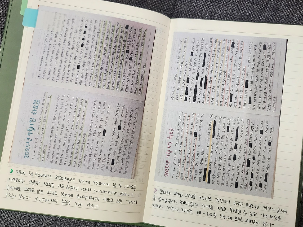 고민하다가, 어떻게든 재가공을 하기로 결심하고 다시 예전처럼 '그냥 막' 썼다. 그리고 10월 한 달 동안 이 모닝페이지를 다시 읽고 편집하는 데에 많은 시간을 썼다. 매일 아침 쏟아내듯 써 내려간 글 위에 다시 밑줄을 긋고, 문장을 고르고, 기억하고 싶은 마음의 결을 추려내는 작업이었다. 말하자면 쓰기의 시간이 끝난 뒤, 처음으로 '읽기의 시간'을 가진 셈이었다.