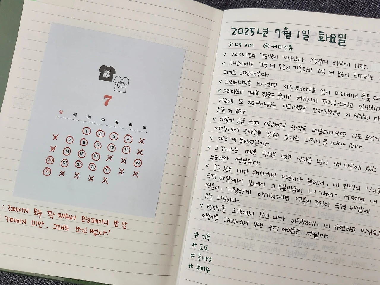 "그땐 정말 힘들었는데"라고 막연하게만 기억이 남아있는 과거의 순간들. 그러나 기록물을 통해 다시 되돌아보니 모닝페이지 속의 나는 꽤 단단하게 버티고 있었다. 휘청이면서도 쓰러지지 않았고, 흔들리면서도 방향을 잃지 않았다. 모닝페이지는 어찌 보면 과거의 나를 나의 기억보다 더 객관적으로 담고 있었다. 감정에 휩싸인 기억이 아니라, 살아낸 하루하루의 증거가 기록이 되어 고스란히 남아 있었다.