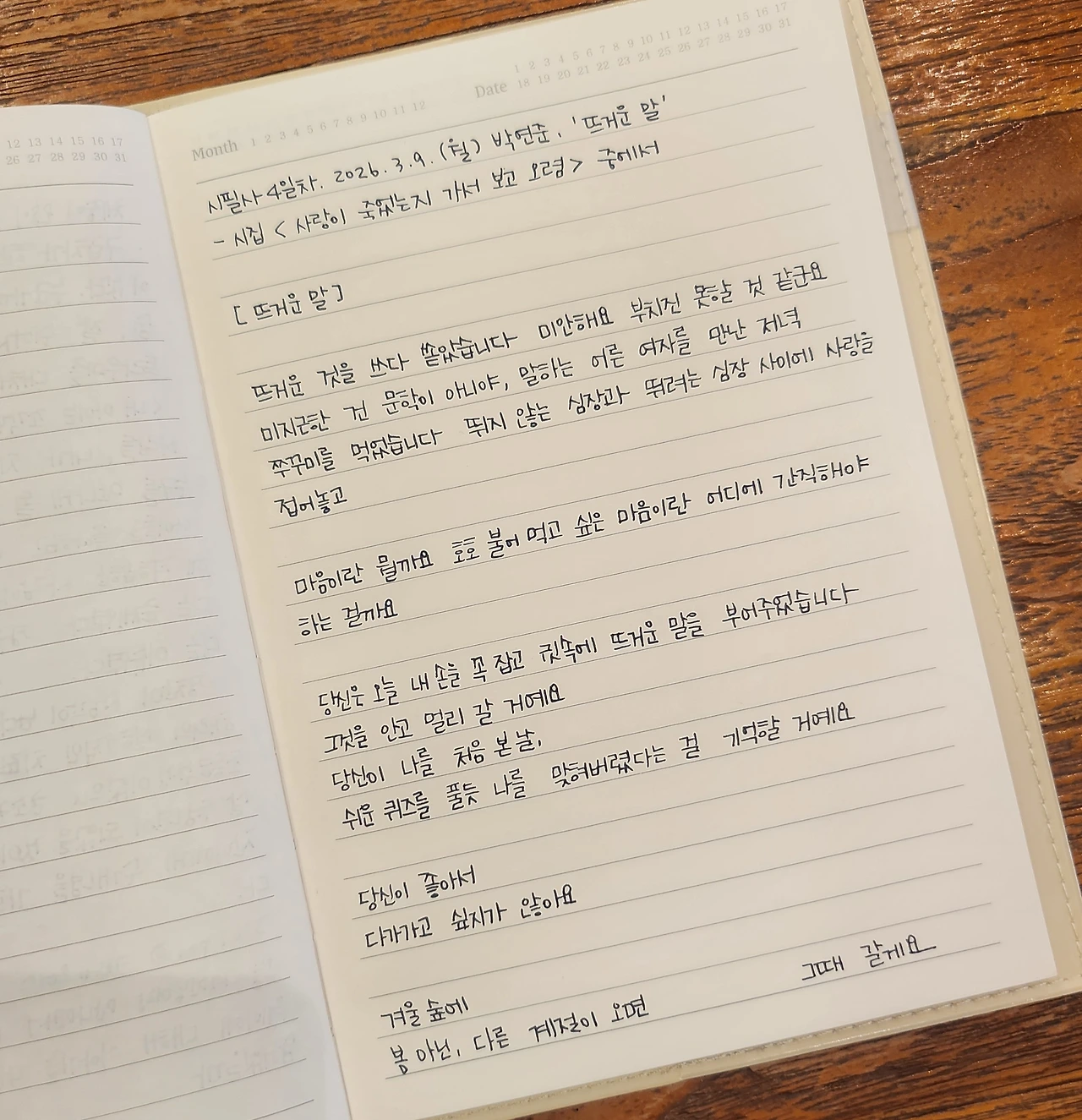 시필사 4일 차. 2026. 3. 9. (월) 박연준, ‘뜨거운 말’ - 시집 <사랑이 죽었는지 가서 보고 오렴(2024)> 중에서
