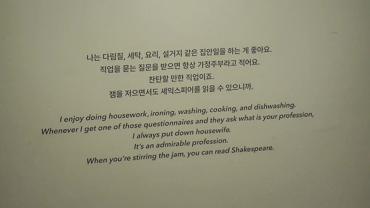 누군가는 집안일을 하면서도 여전히 ‘작가’이고, 누군가는 그 모든 일을 중심에 두고 ‘가정주부’이다. 이 차이는 개인의 선택에서 비롯되는 걸까. 왜 그녀는 수많은 이름 중에서 ‘가정주부’를 선택했을까. 나는 다시 이 문장을 곱씹어 본다. 직업을 묻는 질문을 받으면 항상 가정주부라고 적어요. 찬탄할 만한 직업이죠. 이건 개인의 선택이라기보다는 훨씬 오래된 어떤 기본값에서 비롯된 것처럼 느껴졌다.