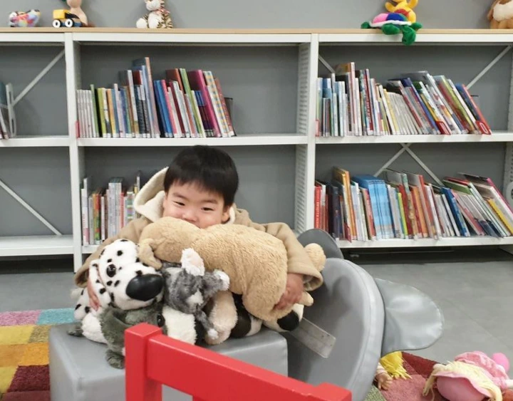 이 아름다운 공간에 아이들과 처음 갔을 땐, 사실 책은 단 한 권도 읽고 오지 못했다. 대신에 우리는 인형놀이를 실컷 하다 왔다. 이곳의 도서관에는 책만큼이나 인형이 잔뜩 있었다. 크기도, 종류도 다양한 동물 인형들이 많아도 너무 많았다. 그래서 4살 둘째와 2살 셋째의 눈에는 책보다는 집에서 한 번도 가지고 놀지 못한 처음 보는 인형들이 더 매력적이었을 것이다. 자꾸 반복해서 도서관에 가다 보니 자기가 좋아하는, 특별히 정이 가는 도서관 인형도 생겼다. 엄마가 책을 읽어줄 때면 자기가 좋아하는 인형을 꼭 껴안은 채 이야기를 듣기도 했다. 집에 와서 함께 침대에 누우면 가끔 "도서관에 있는 그 호랑이 인형은 잘 있을까?" 하며 인형의 안부를 궁금해하기도 했었다.