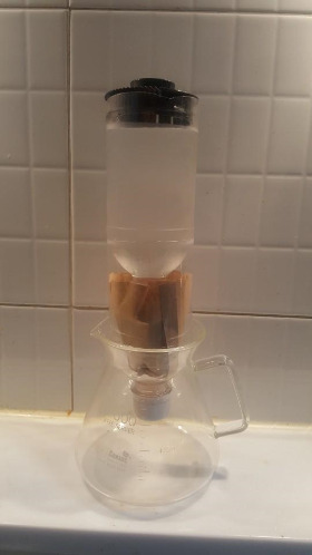 더 이상 잔소리할 기운도 없고 해서 녀석이 하는 대로 놔뒀더니, 정말로 페트병 두 개에서 한 방울씩 커피가 떨어져 더치커피가 만들어진다.