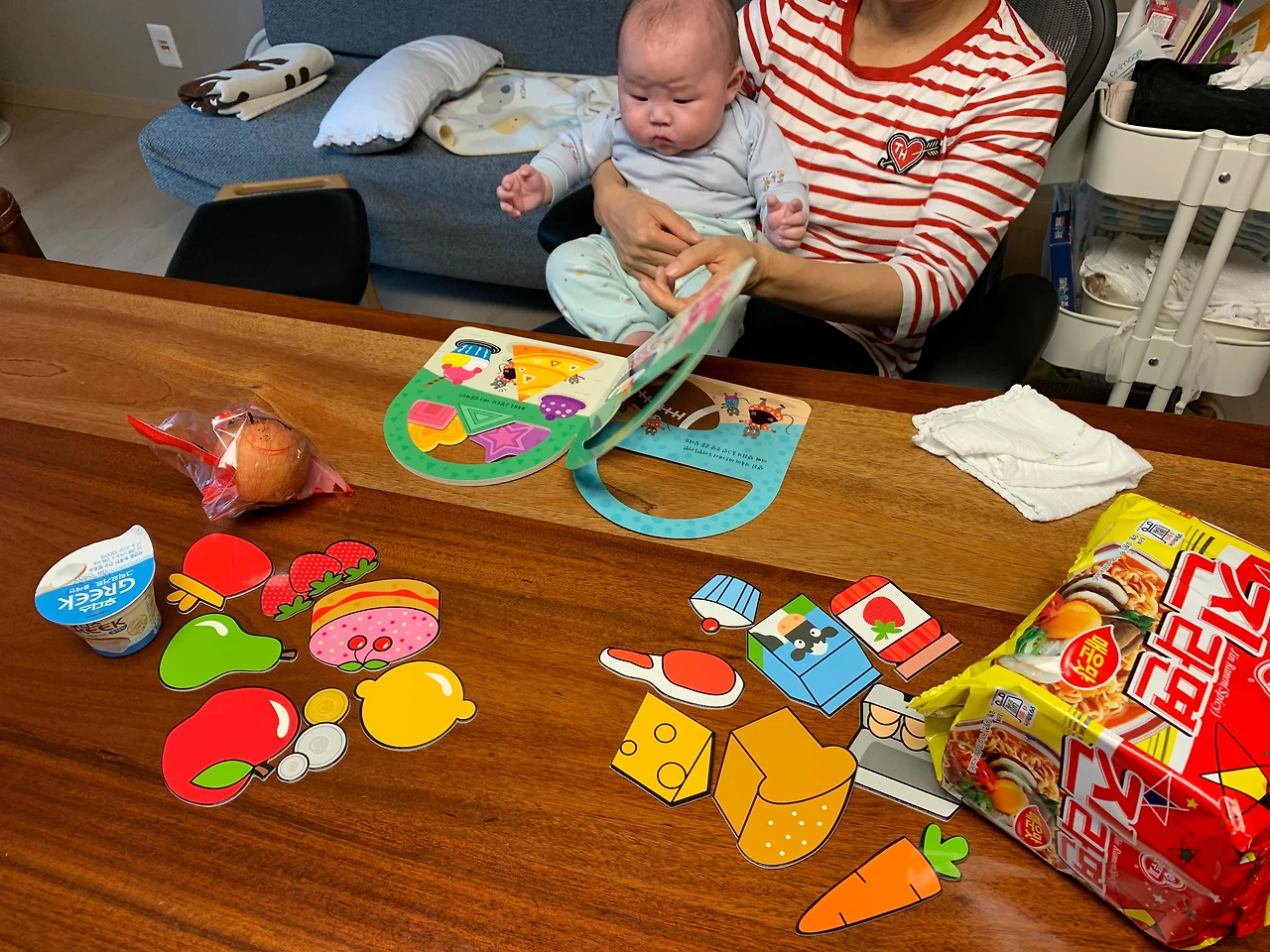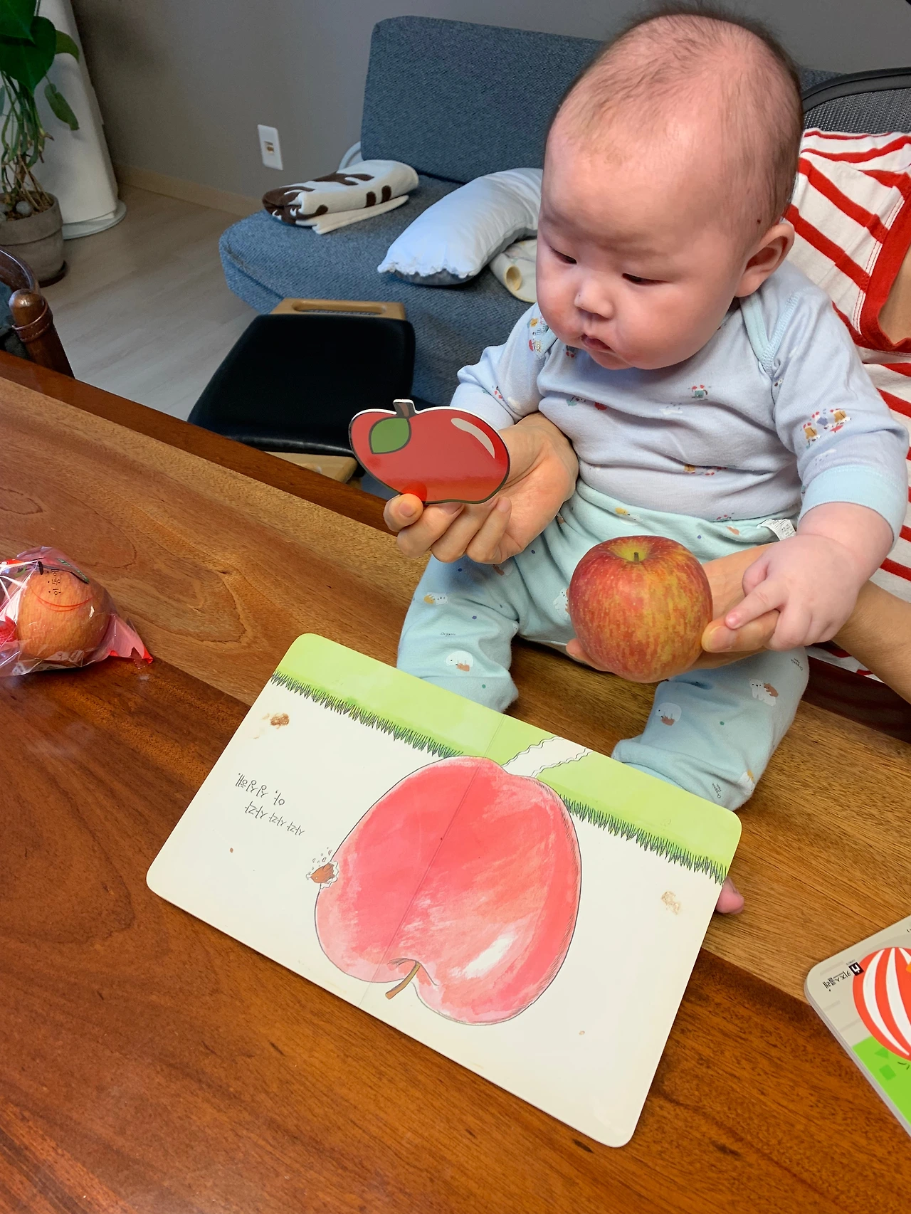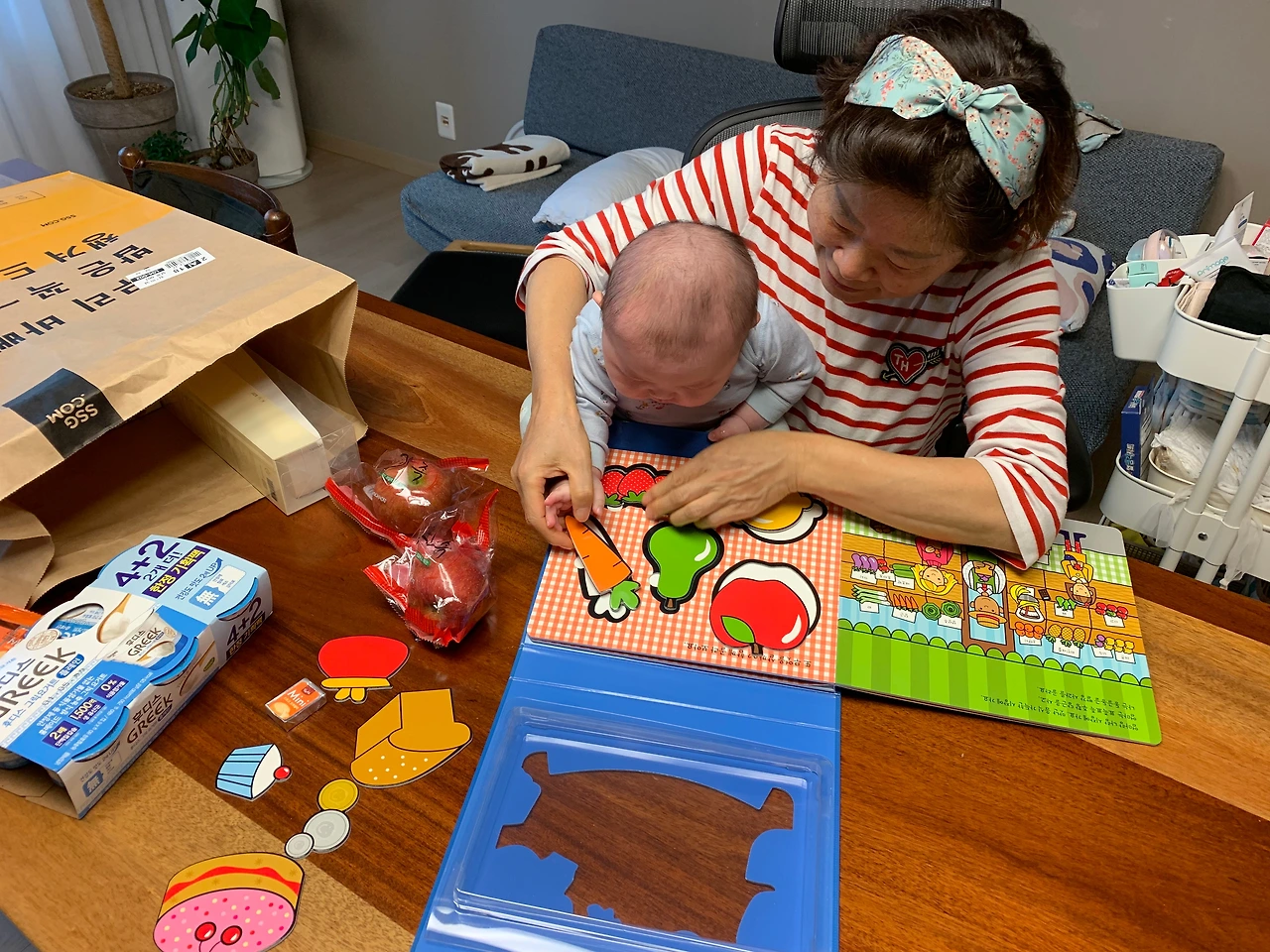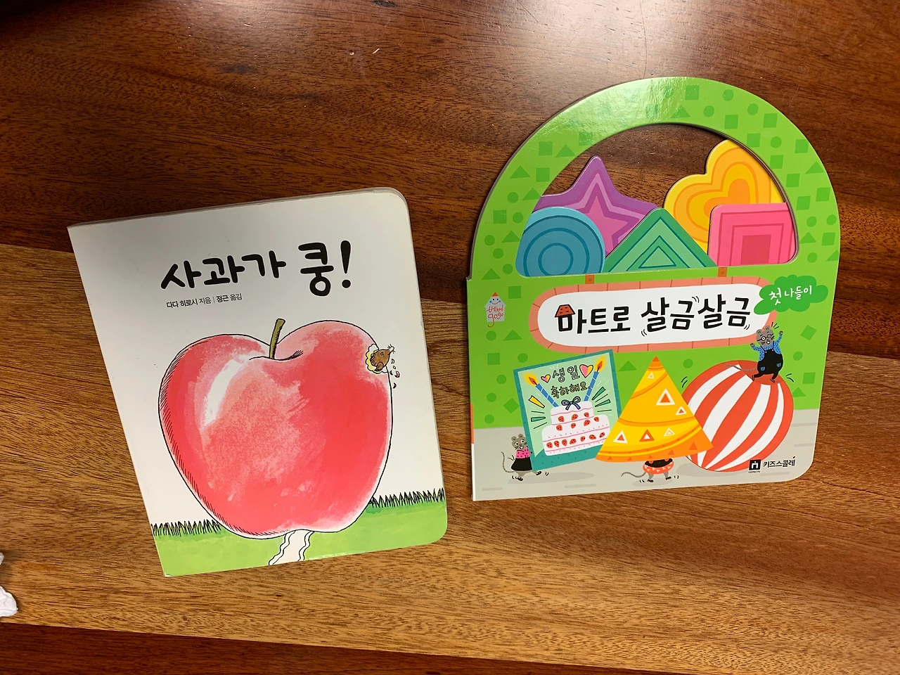 사과를 샀으니 사과에 관련된 스토리 한권, 마트에 가서 동그라미, 네모, 세모를 배우는 책 한권~!