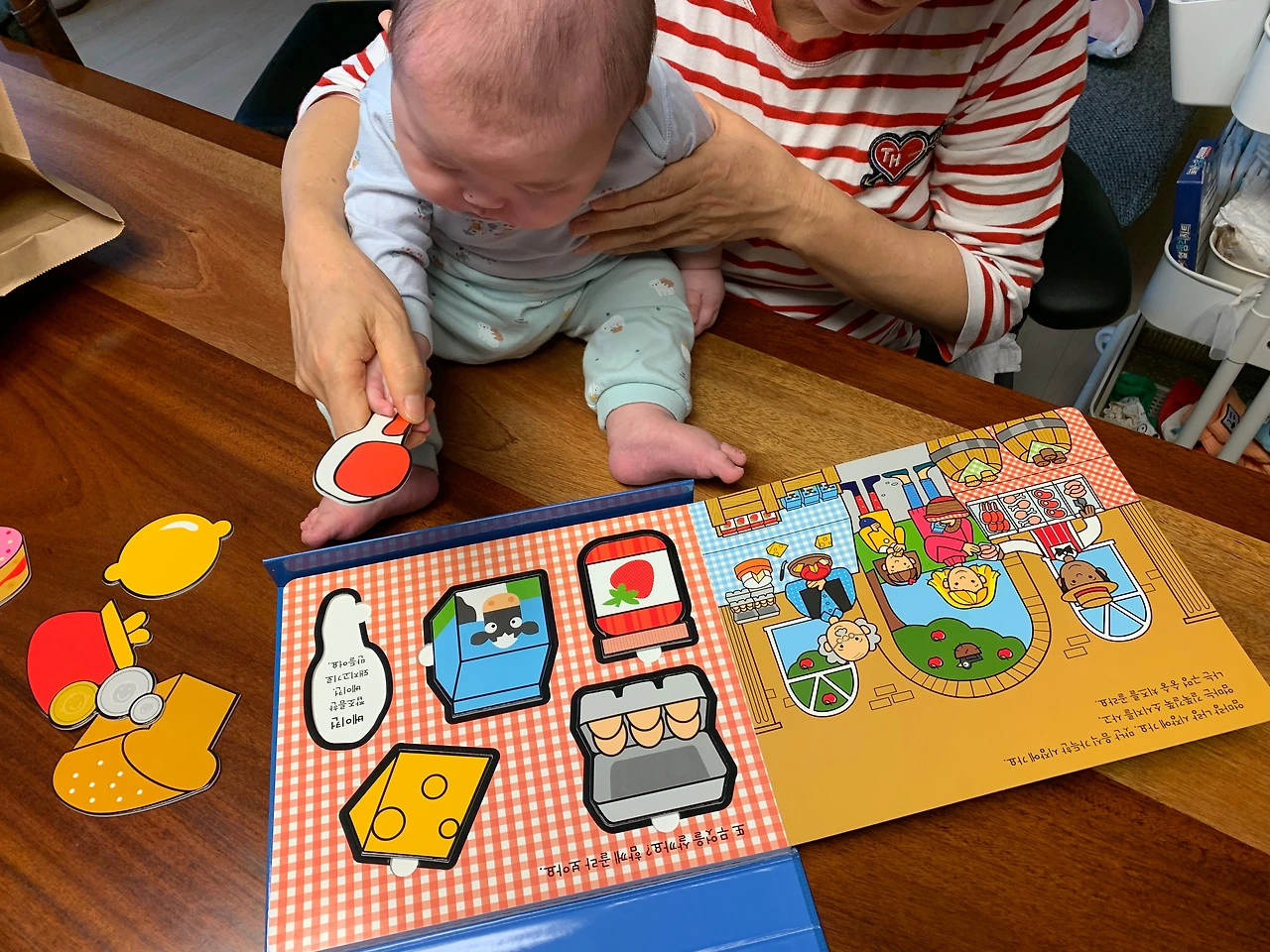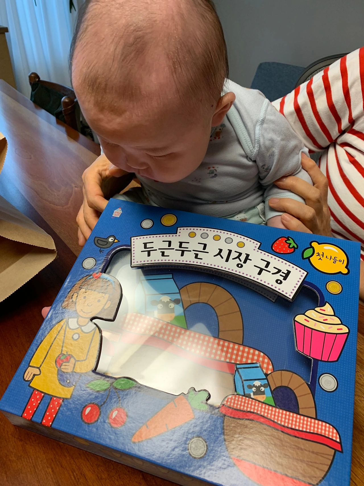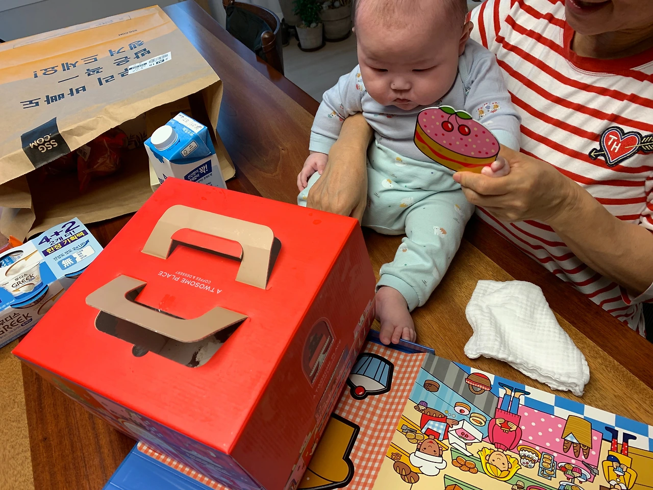 사과를 샀으니 사과에 관련된 스토리 한권, 마트에 가서 동그라미, 네모, 세모를 배우는 책 한권~!