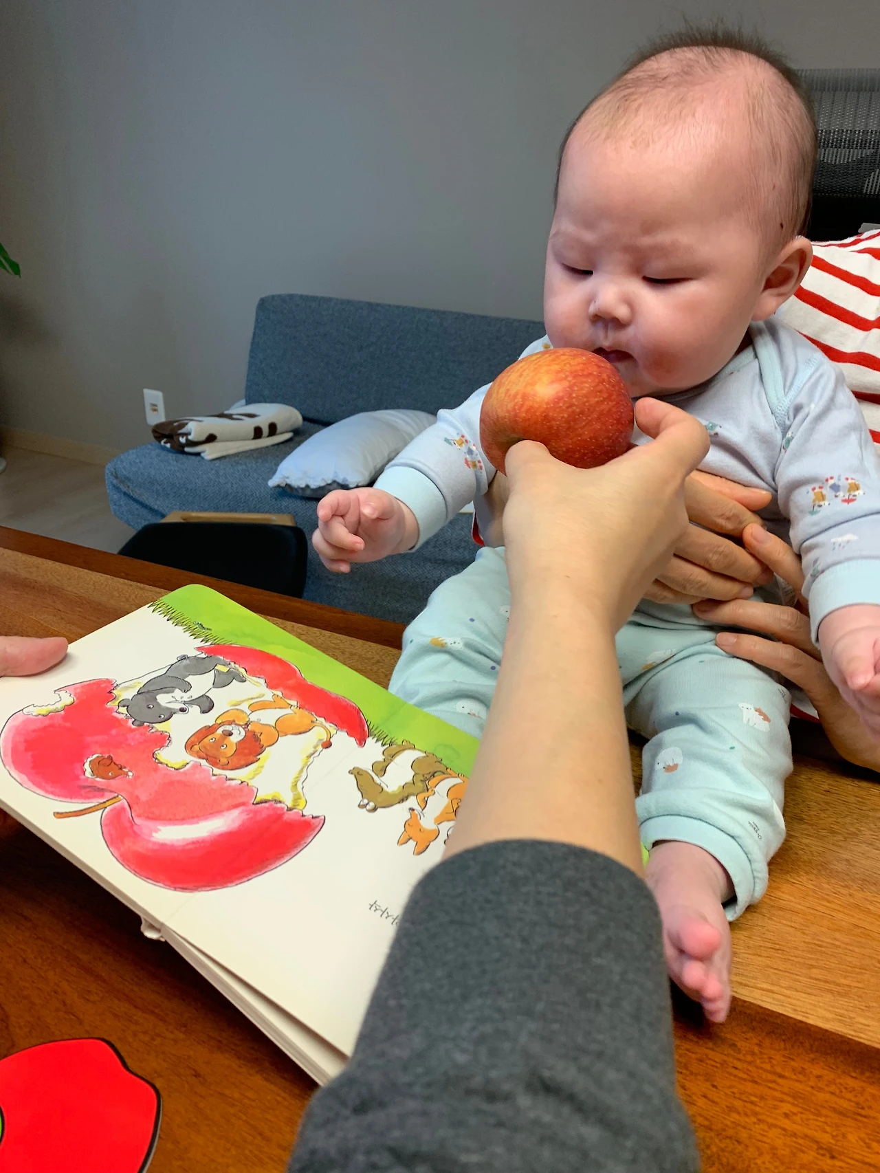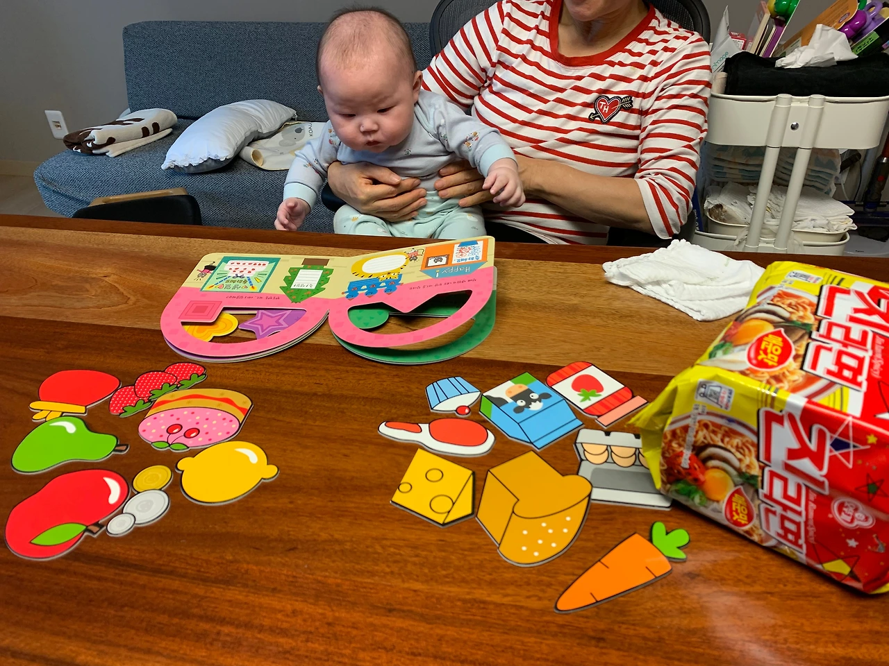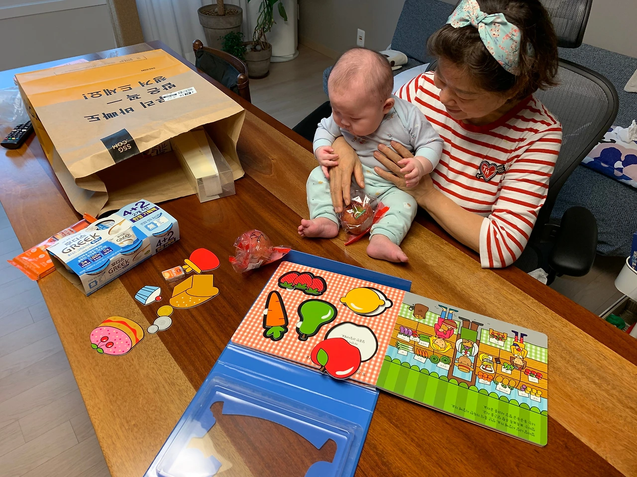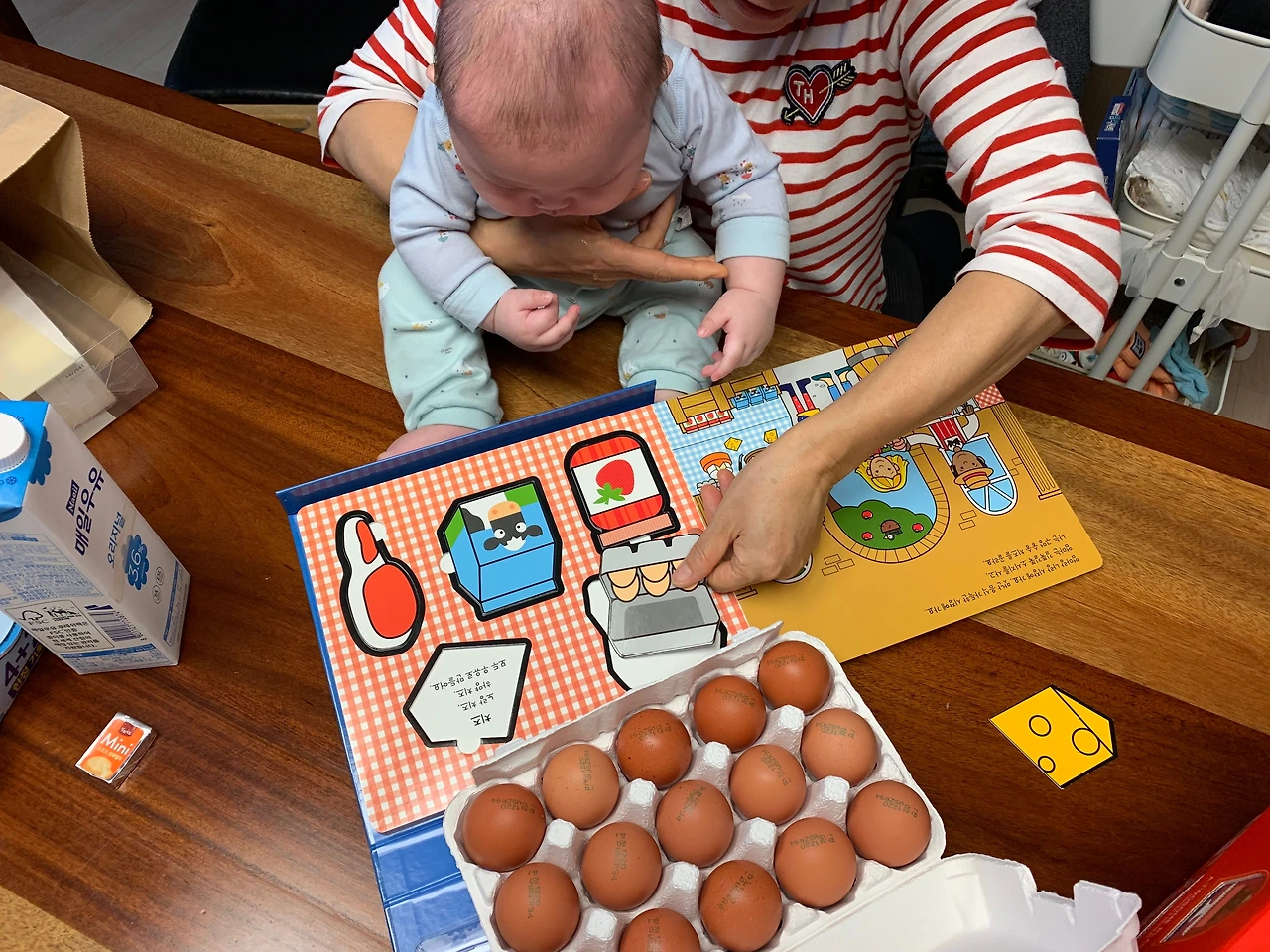사과를 샀으니 사과에 관련된 스토리 한권, 마트에 가서 동그라미, 네모, 세모를 배우는 책 한권~!