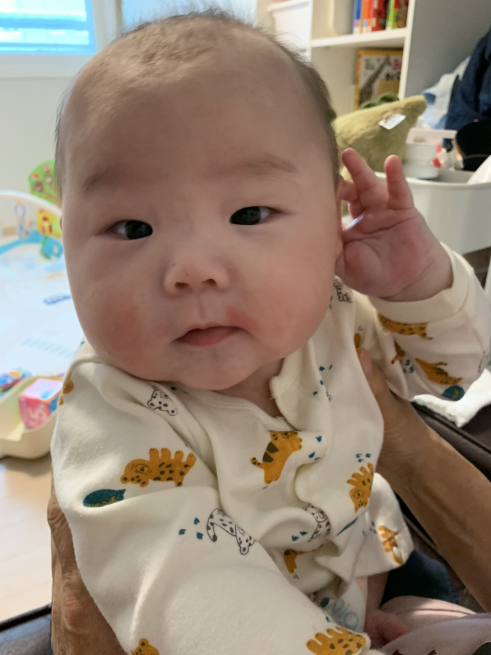 이유식 먹을때까지 수저를 들고 기다려 봅니다.