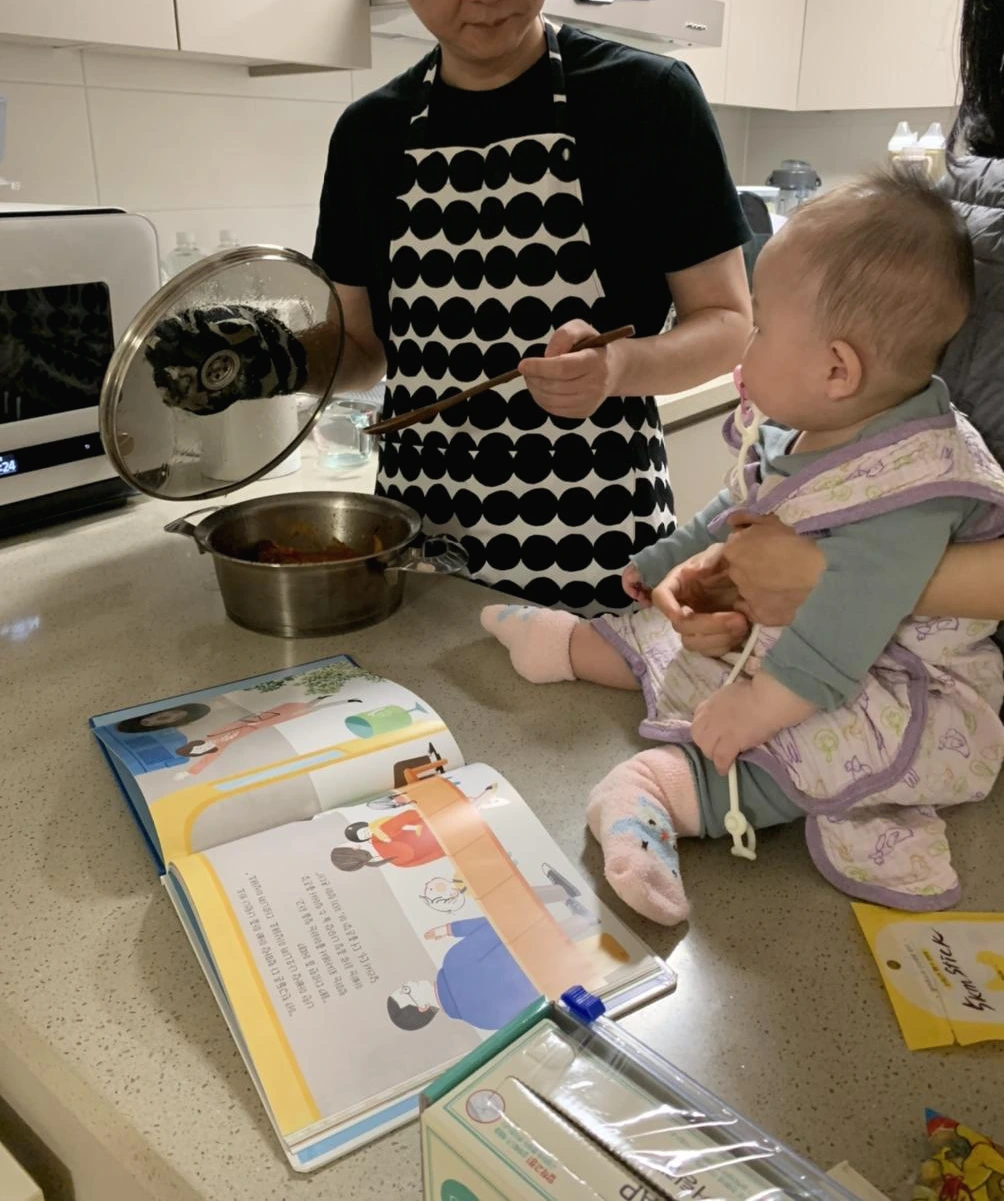 오늘은 아빠가 부엌에서 요리를 하셨어요.