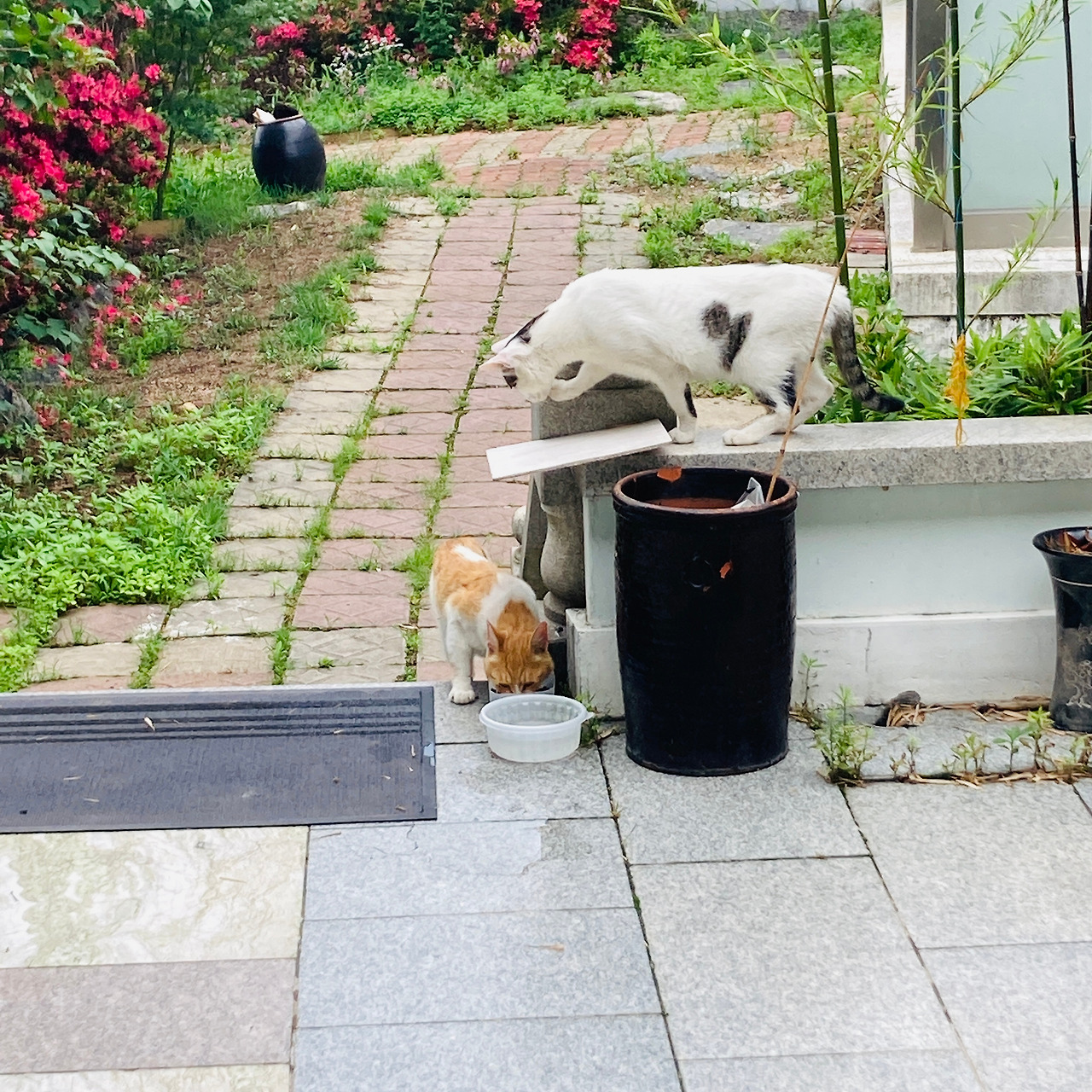 사료가 입에 맞는지 밥은 얼마나 먹고 갔는지 밥통을 시시때때로 체크하고 물도 먹어야 할 텐데.. 하며 고양이 엄마가 된 것 마냥 걱정했다. 밥을 다 비우면 또 채워놓고, 사료통에 빗물이 들어가면 안 되니까 간이 지붕도 만들어줬다.