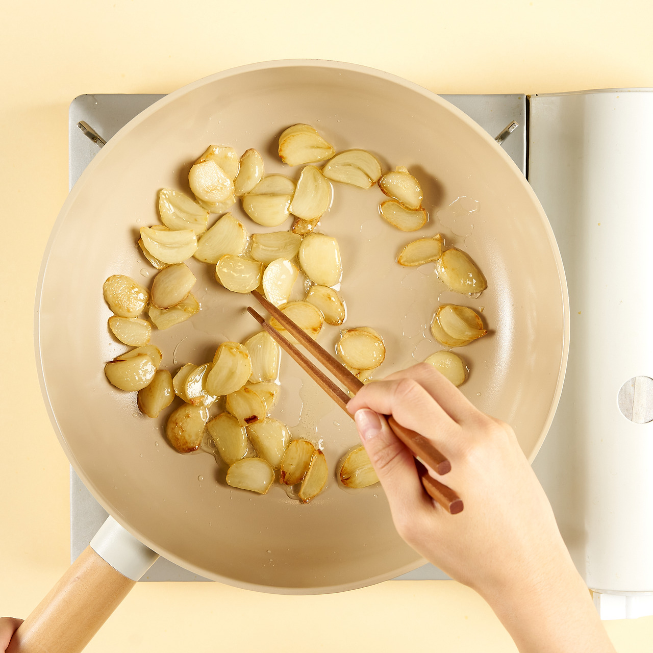 2. 예열 냄비에 포도씨유를 두르고 슬라이스한 마늘을 넣고 약불에서 노릇하게 볶는다.