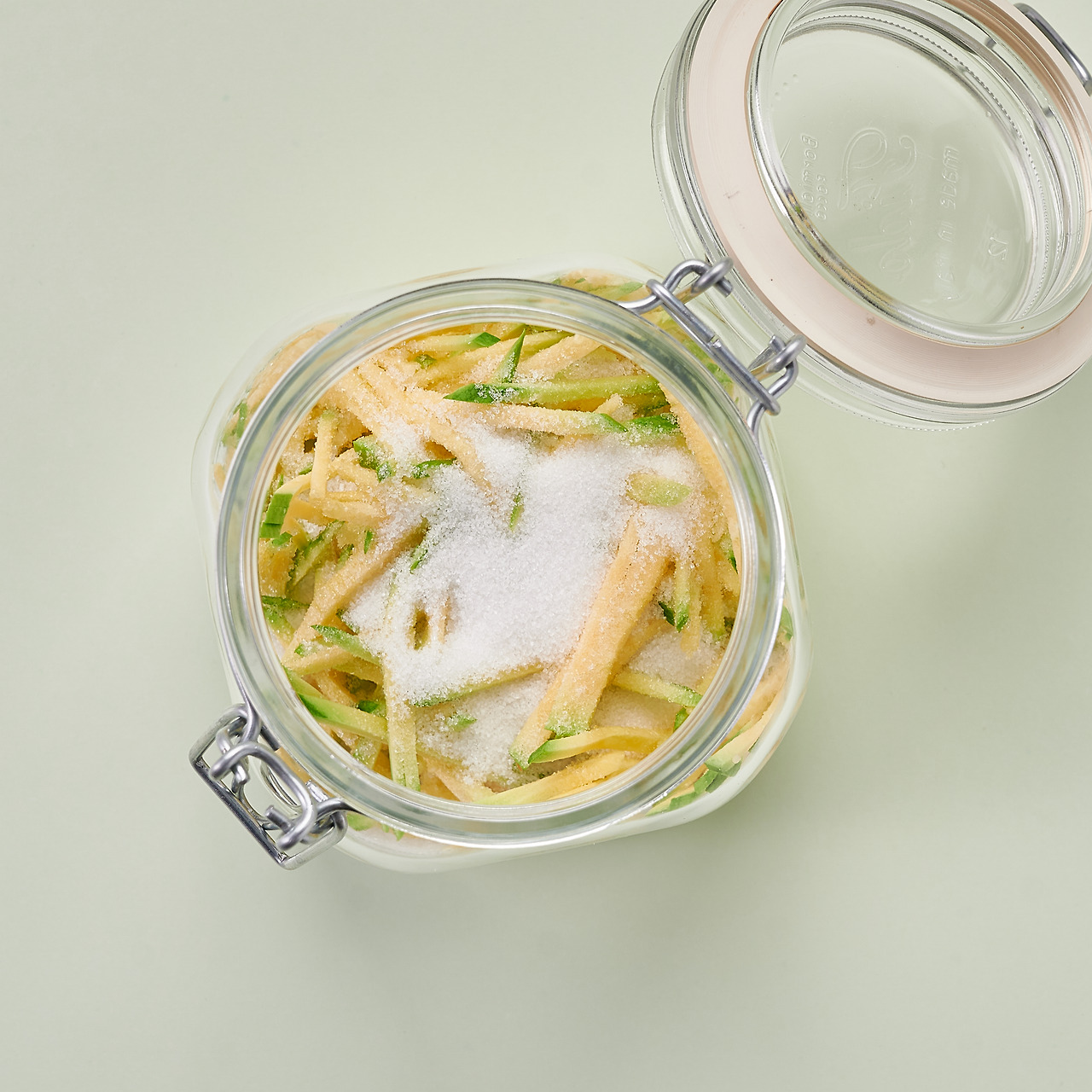 2. 1과 설탕을 잘 섞어준 뒤, 1주일 냉장보관해 당절임을 만든다.