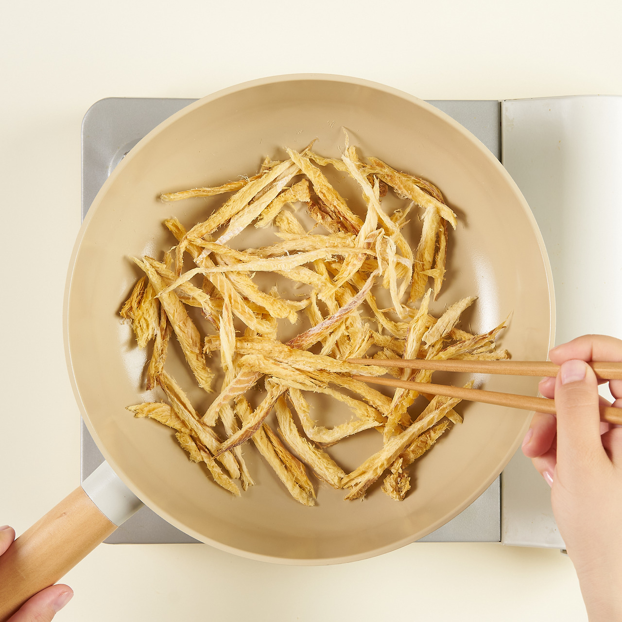 2. 팬을 달구고 먹태를 올려 약한 불에서 바삭해질 때까지 뒤집어가며 굽는다.