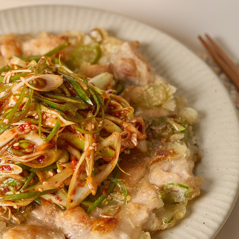 담백한 닭다리살을 넉넉히 사다가 한 입 크기로 썰어 요리에센스 연두에 버무리고, 전분 2 : 물 1의 비율로 반죽물을 넣은 후 청양고추, 편마늘, 간 마늘을 넣어 닭 냄새를 잡아준다. 닭 특유의 누린내가 싫다면 저마다의 냄새 잡기 신공을 써도 좋다. 맛술, 후추, 생강 등등. 그다음 예열 팬에 기름을 넉넉하게 두르고 닭살 반죽을 최대한 넓게 펼쳐 앞, 뒤로 뒤집어가며 노릇하게 구워주면 끝. 가히 어여쁜 ‘닭 부침개’가 되었다.