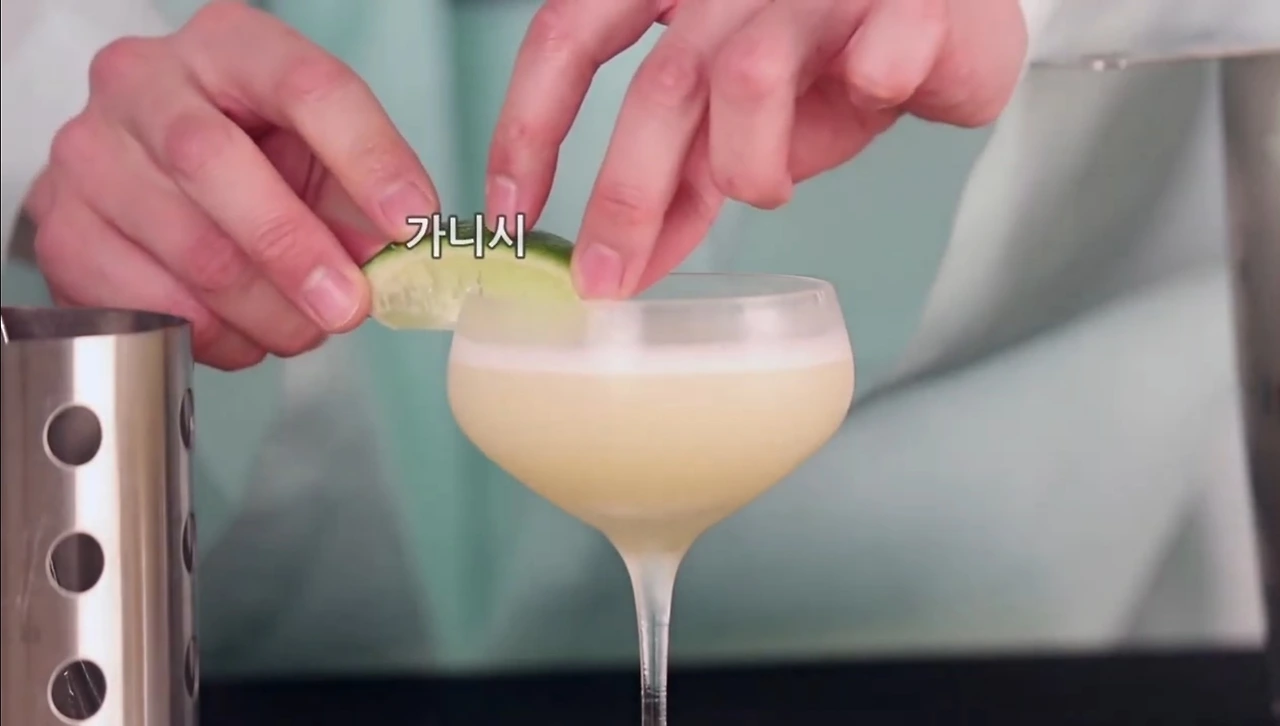 큰 셰이커에 큰 얼음을 하나 넣고 결합한 다음에 쉐이킹 해줍니다. 스트레이너를 결합하고 잔에다가 따라줍니다. 가니쉬로 사용할 라임 조각 하나 꽂아주면 다이키리가 완성됐습니다.