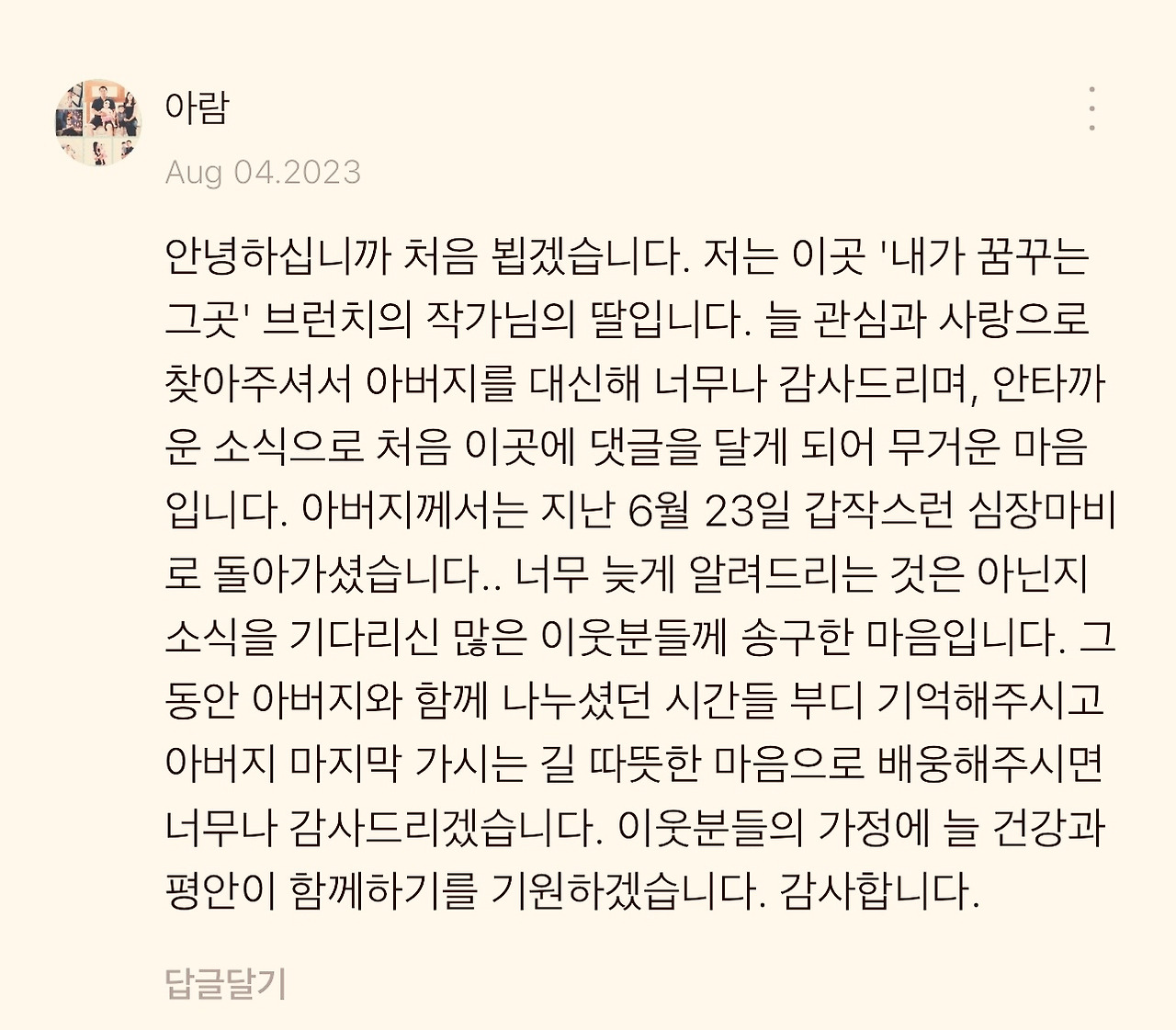 이런 소식을 제가 전해도 되나 생각했지만, 제가 알기엔 '내가 꿈꾸는 그곳' 작가님과 친분 있던 작가님이 꽤 있으셨던 걸로 알기에 이렇게 글을 남깁니다.