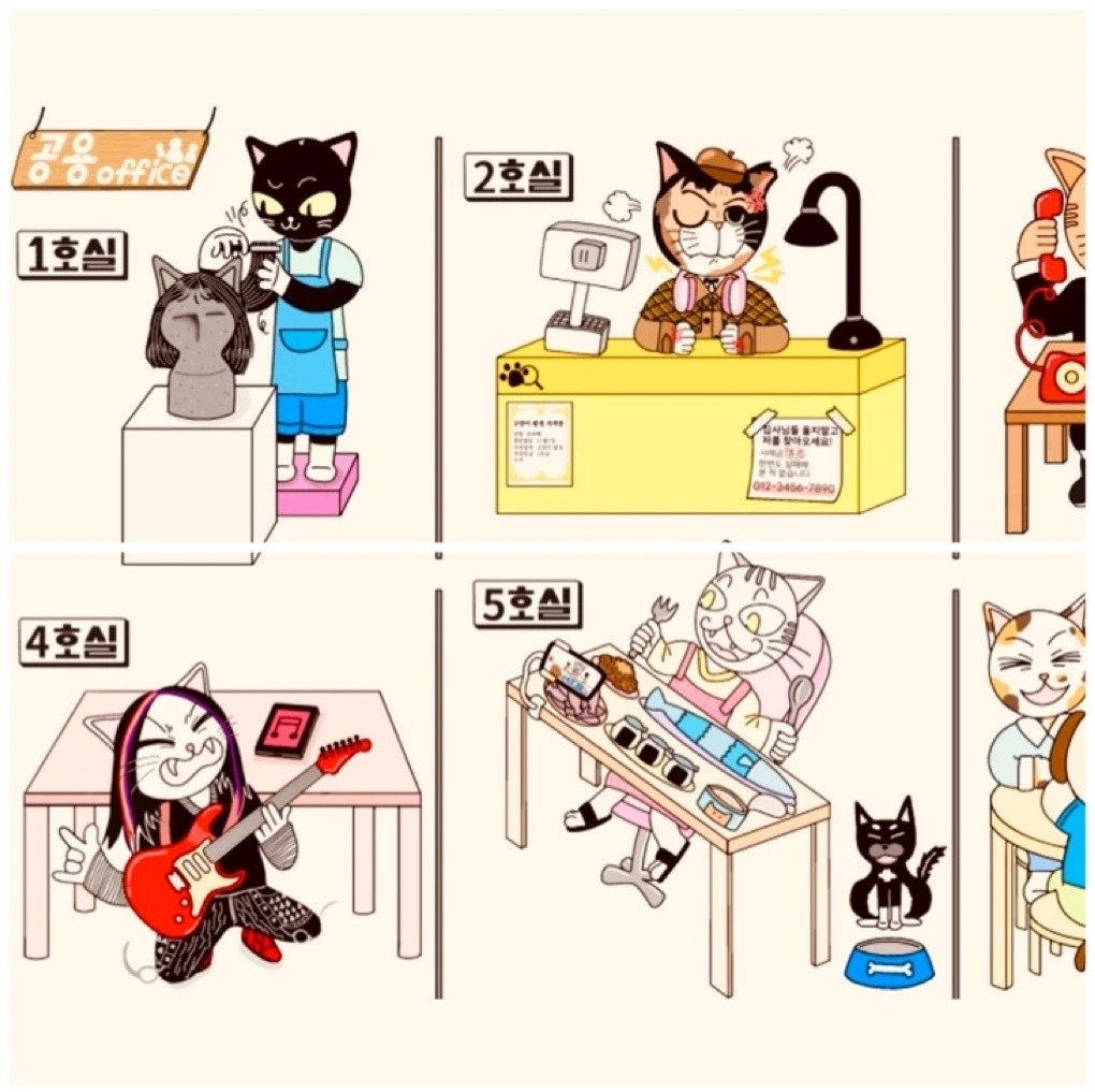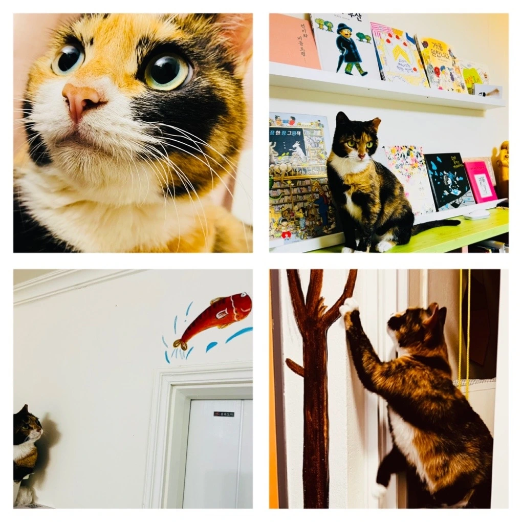 사춘기의 그림에선 라떼와 다섯 마리 새끼가 모두 함께 산다. 벌레를 잡으러 날아오르는 냥이들의 난장판을 보면서도 우린 태연히 말했다.