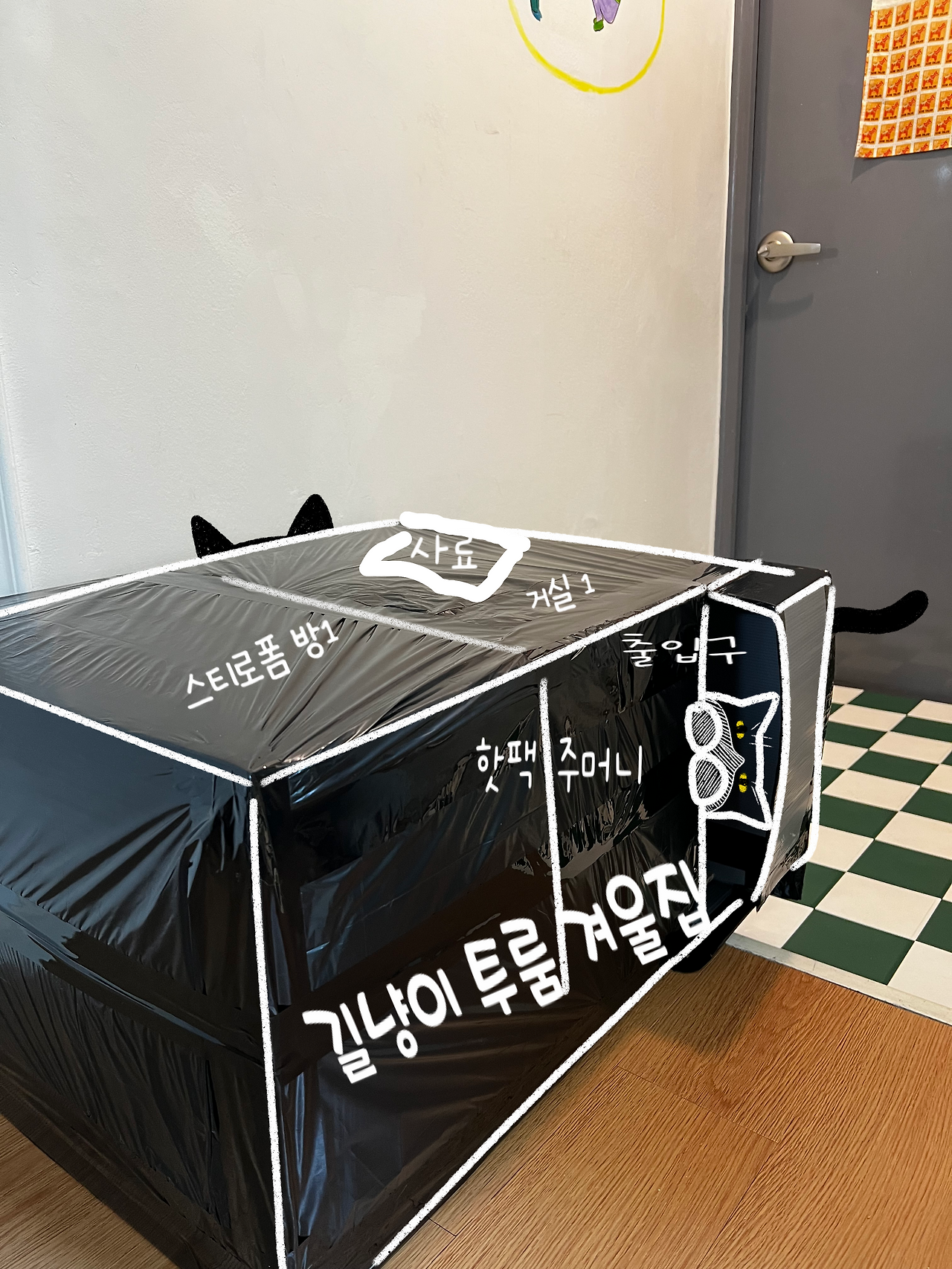 기왕 만드는 거라면 튼튼하게 만들고 싶었다. 나는 단프라 상자 안에 스티로폼 상자로 방을 만들어 넣고, 출입문을 냈다. 핫팩 주머니 둘 자리와 사료 그릇을 놓을 공간까지 마련하니 제법 아늑한 투룸의 겨울 집이 완성됐다. 마음 같아서는 밝고 환한 집을 만들어주고 싶었지만, 그보다는 최대한 눈에 띄지 않는 게 더 중요했다.