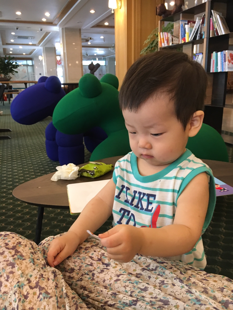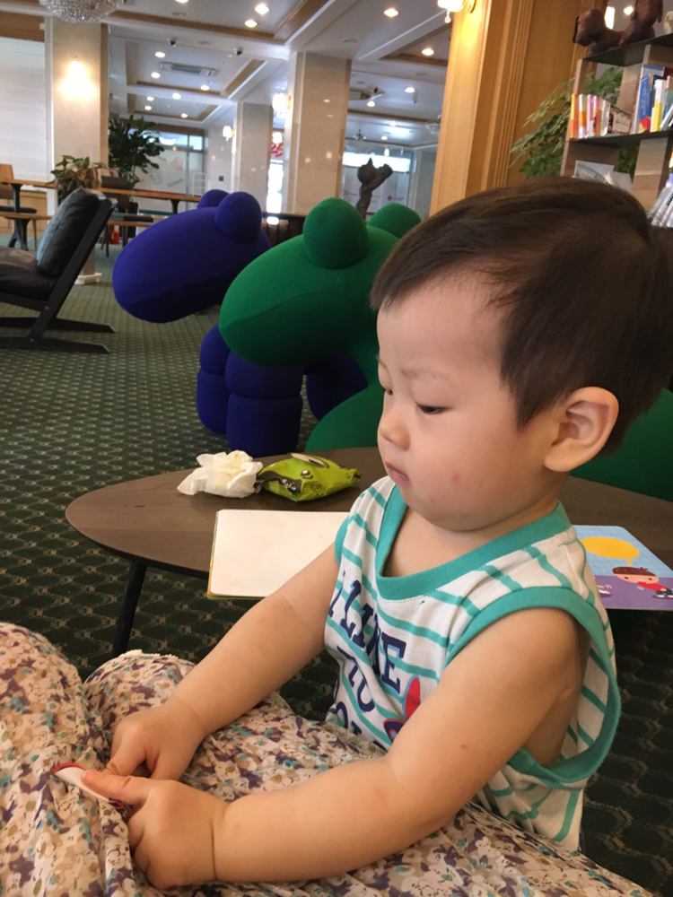 결국 다음날 아침 나는 남편에게 온천욕을 하는 자유시간을 주었다. 남편은 안해도 괜찮다고 했지만 나는 억지로 보냈다. 신랑 생일 기념으로 놀러와서 나만 즐기면 안되니 말이다. 그리고 나는 세민이와 호텔로비에서 스티커 놀이를 하며 다행히(?) 얌전하게 시간을 보냈다^^