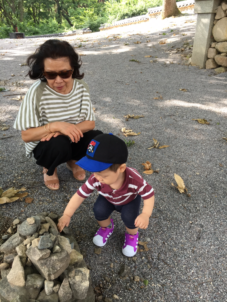 아들은 사람들이 쌓아놓은 돌탑을 보며 고사리손으로 돌맹이를 올렸다 내렸다한다.