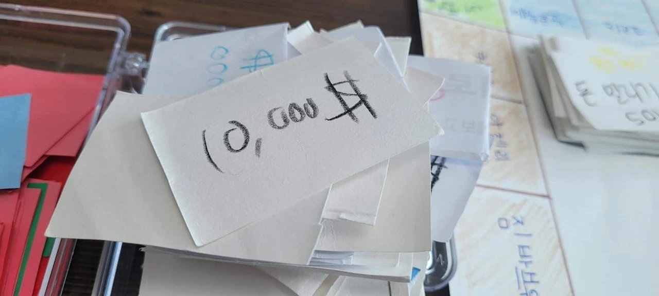 4) 게임에 쓸 화폐 만들기 : 최소 단위 1만불을 기준으로 넉넉하게 100장쯤 만든다. 참고로 도화지 한 장을 5번 접으면 32장이 만들어진다.
