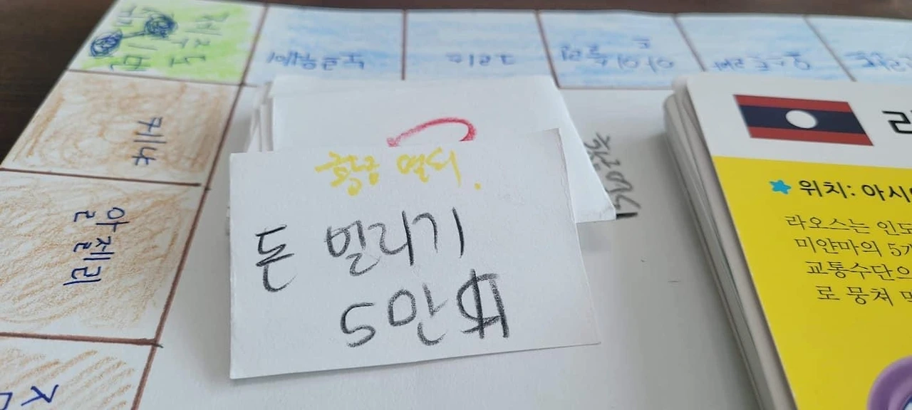 5) 황금열쇠 카드 만들기 : +10만불 로또, -10만불 벌금, 춤추고 노래하기, 팔굽혀펴기 10번, 앉았다 일어섰다 10번 등 아이와 함께 이런 저런 재미있는 내용을 자유롭게 적는다.